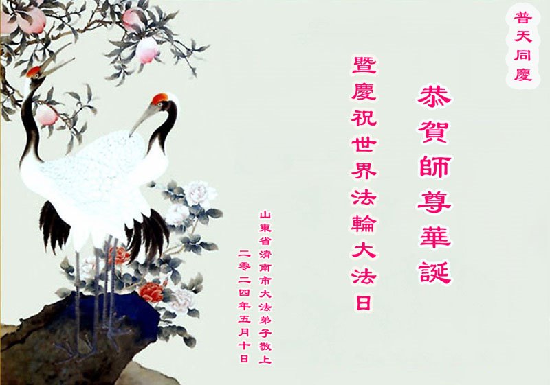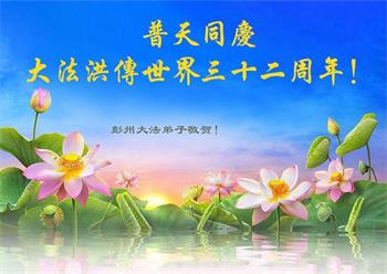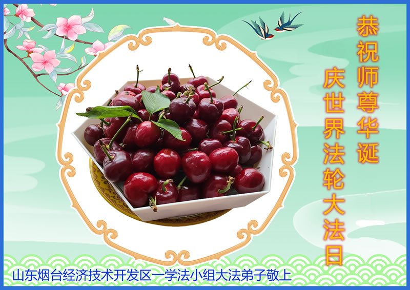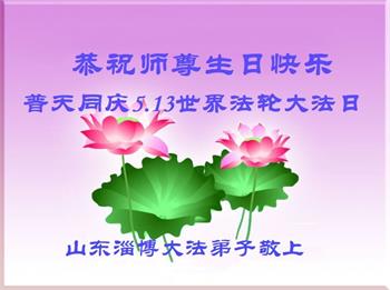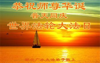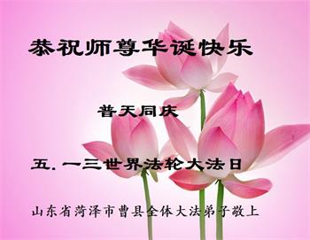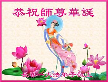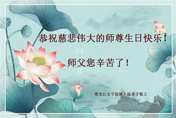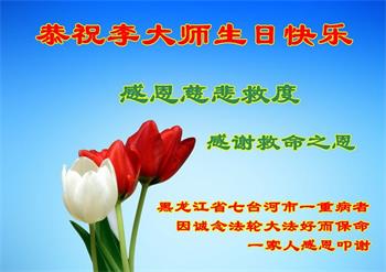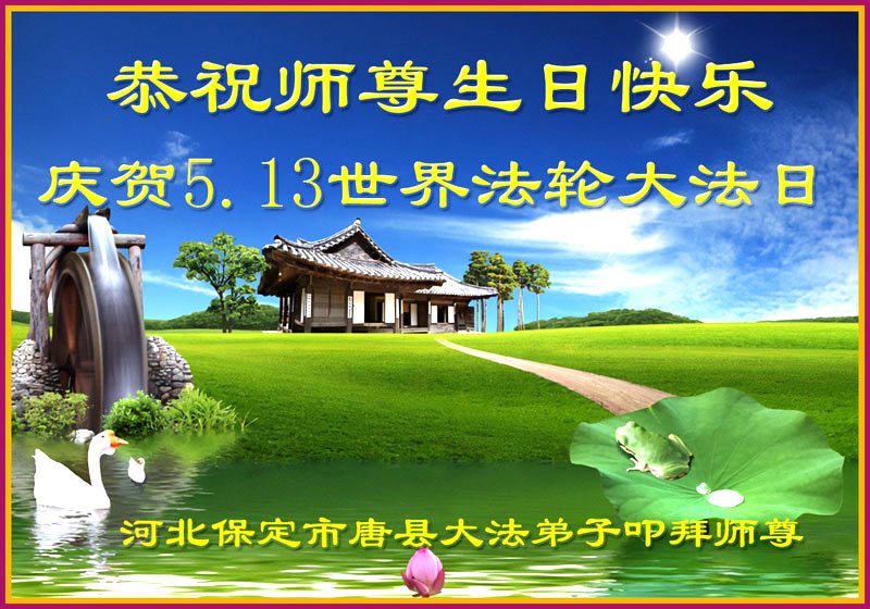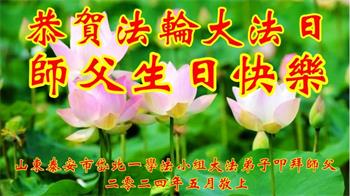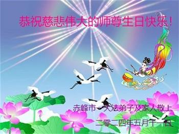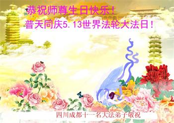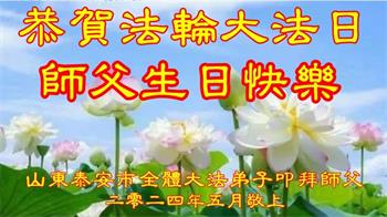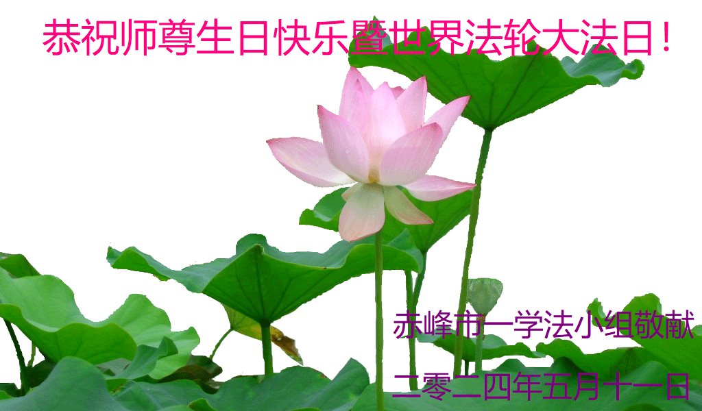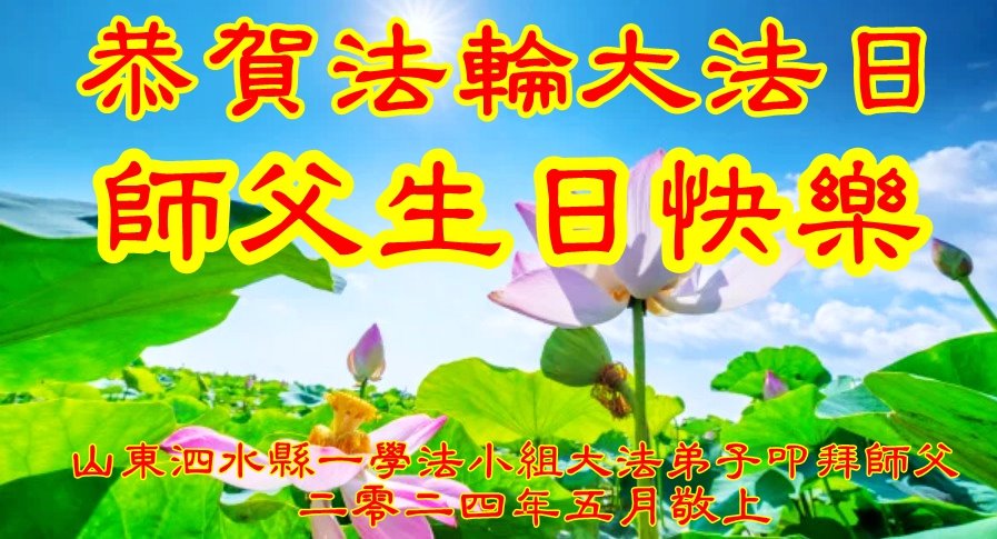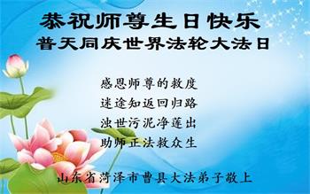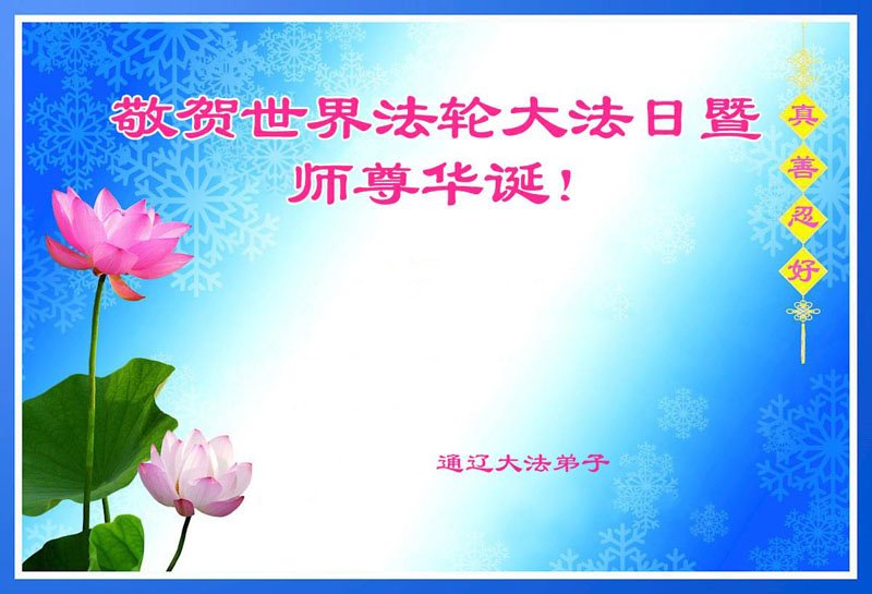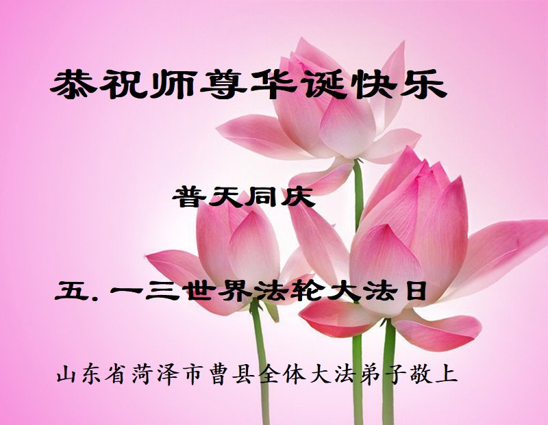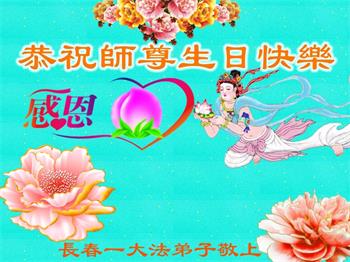 我是开发区大法弟子,看师父各地讲法时泪水连连,师父操心弟子,救度各地众生,非常的辛苦。每次我都对自己要求,做好三件事,对得起师父的苦度。我一人炼功,全家人都受益,都支持。我一家十一口人感恩师父,同庆世界法轮大法日!恭祝师父生日快乐!