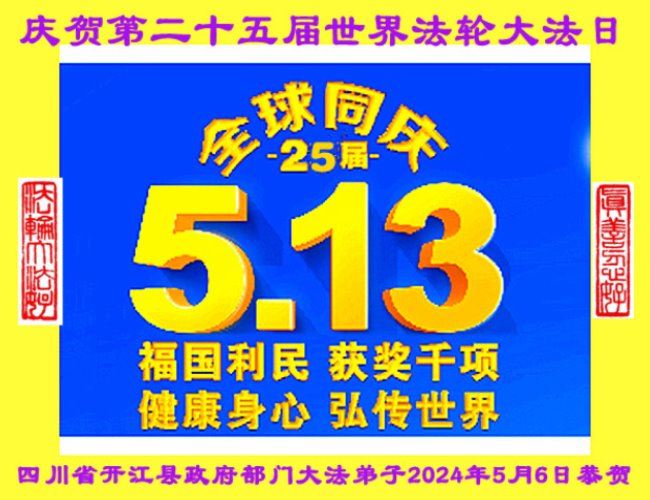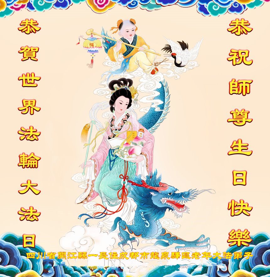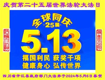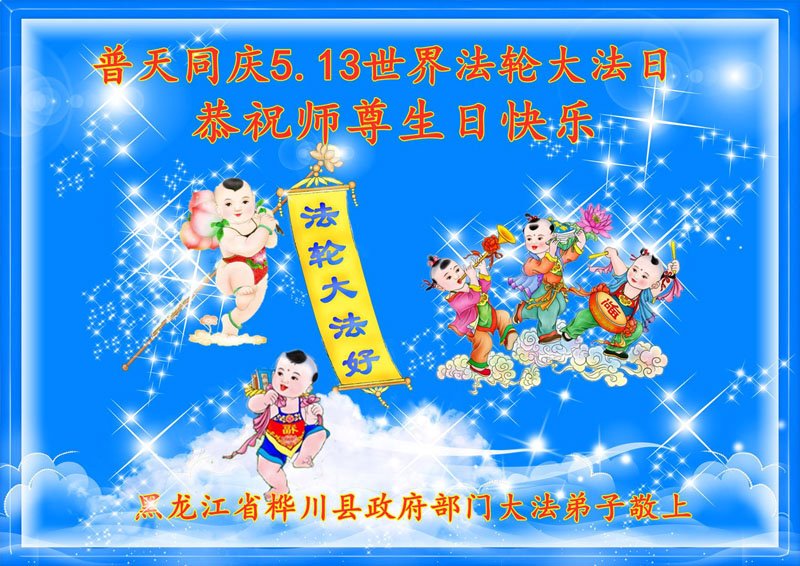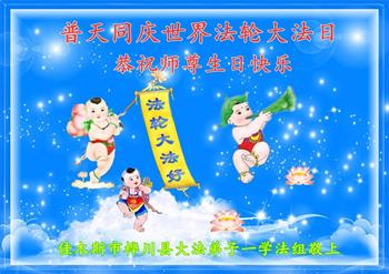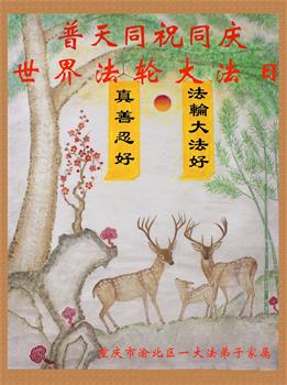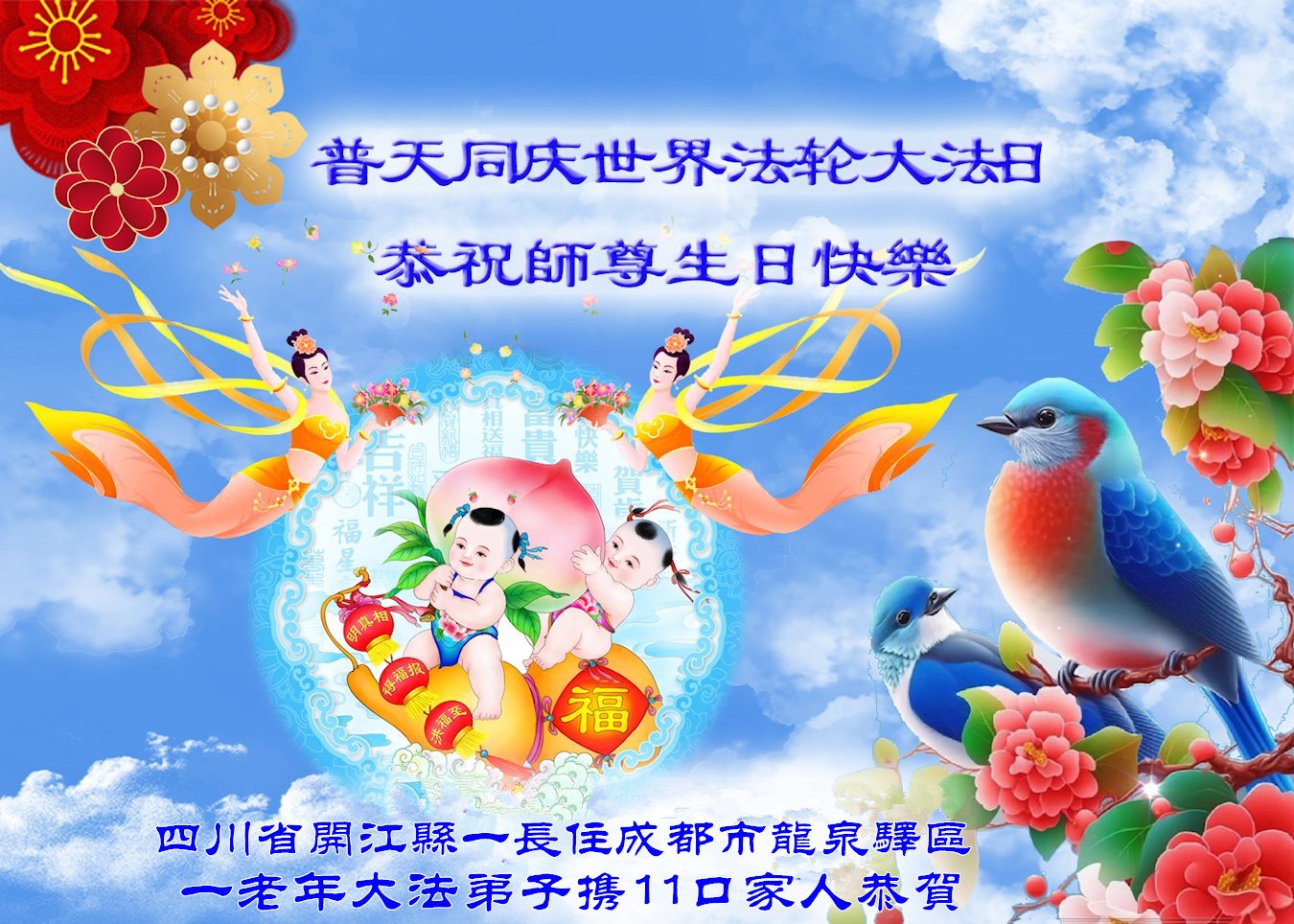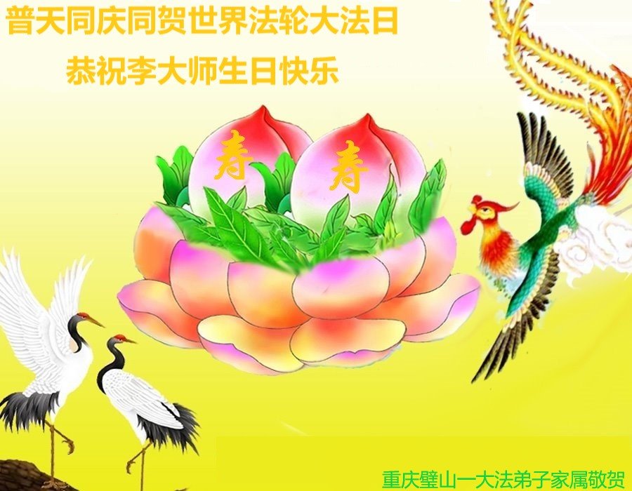 重庆市长寿区一弟子家族六十三人恭贺“五·一三”世界法轮大法日,他们表示:“我们全家六十三人都相信大法好!并受益于大法。孙女、女婿曾遇车祸,安然无恙;九十岁的老人病重,诚念‘法轮大法好 真善忍好’脱离危险,至今身体健康!全家老小六十三人发自内心恭祝慈悲伟大的师父生日快乐!感恩师父救度之恩重如山!”