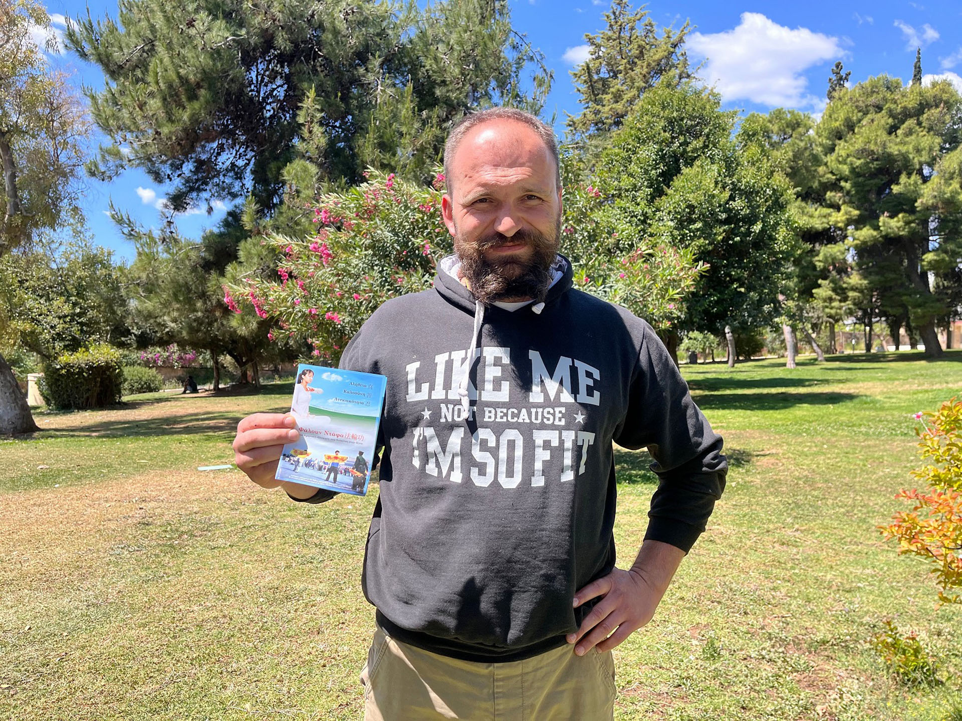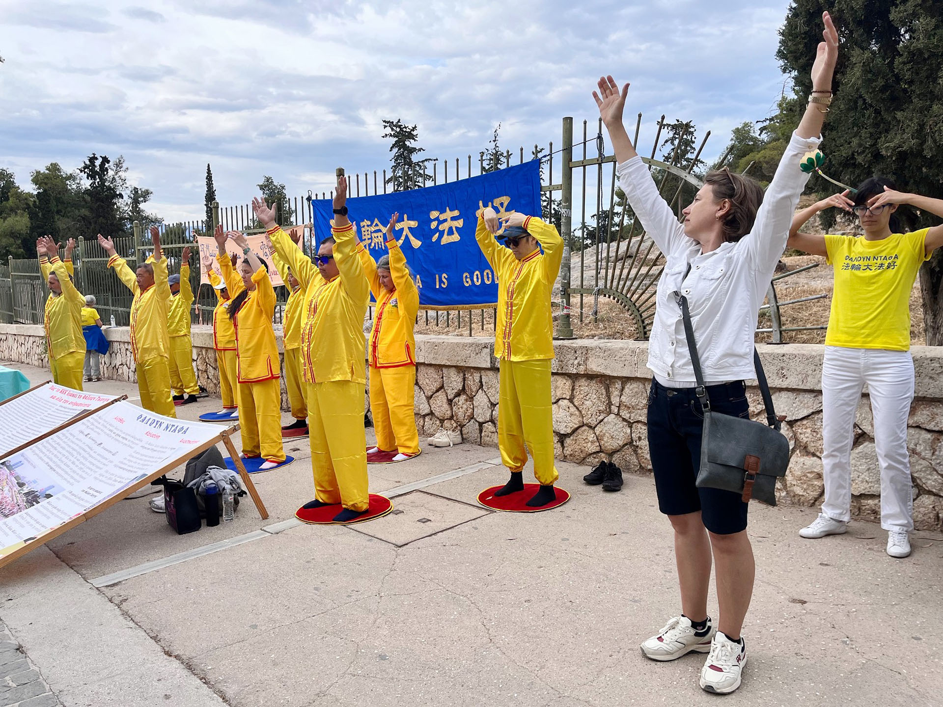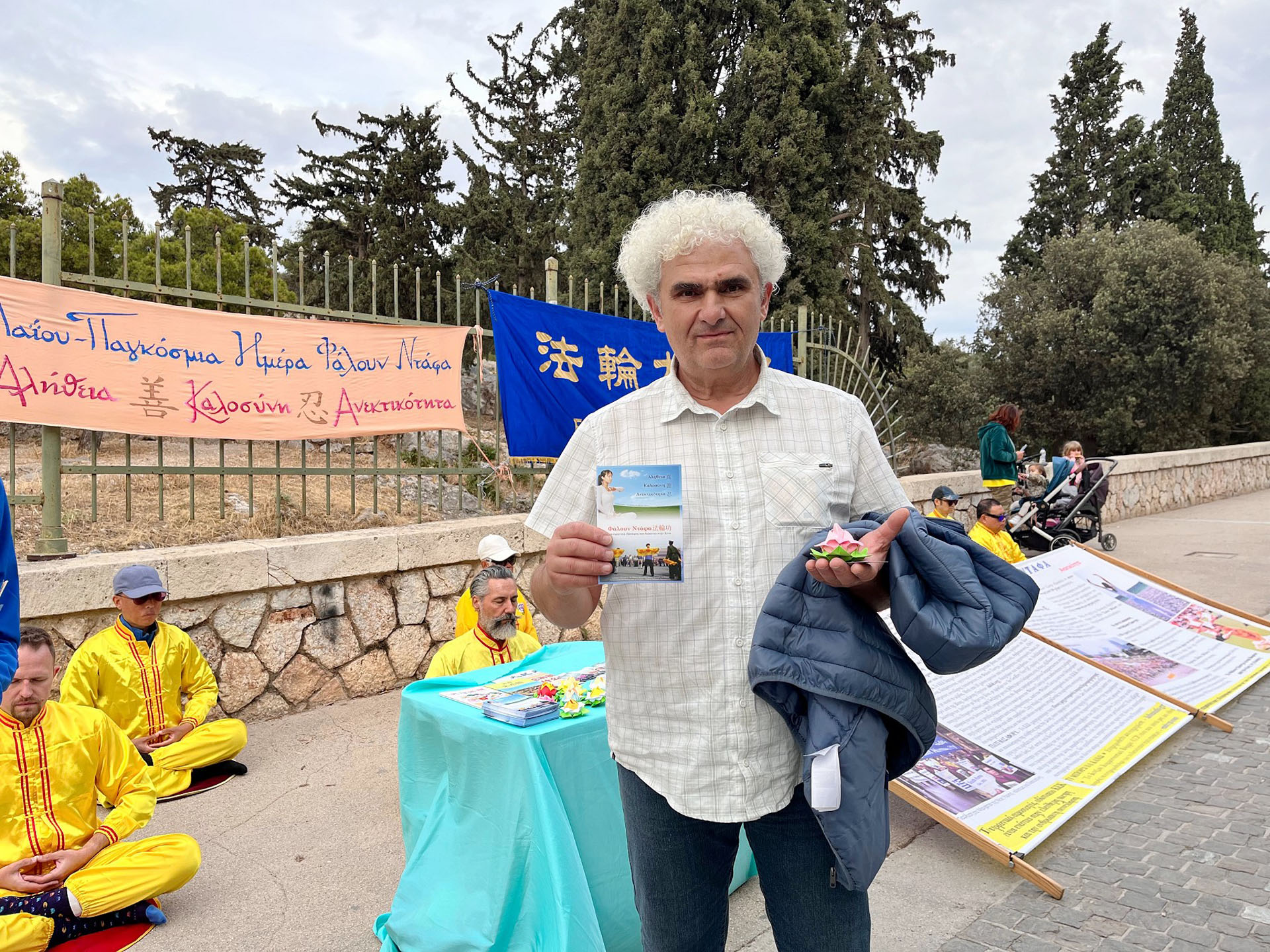 五月十一日,希腊人格里格力斯·佩利奥斯(Grigoris Pilios)在活动现场,跟着学员们的动作炼了法轮功的前四套功法。次日,他来到炼功点,学了第五套功法。格里格力斯告诉学员:“我感到了身心和谐。”