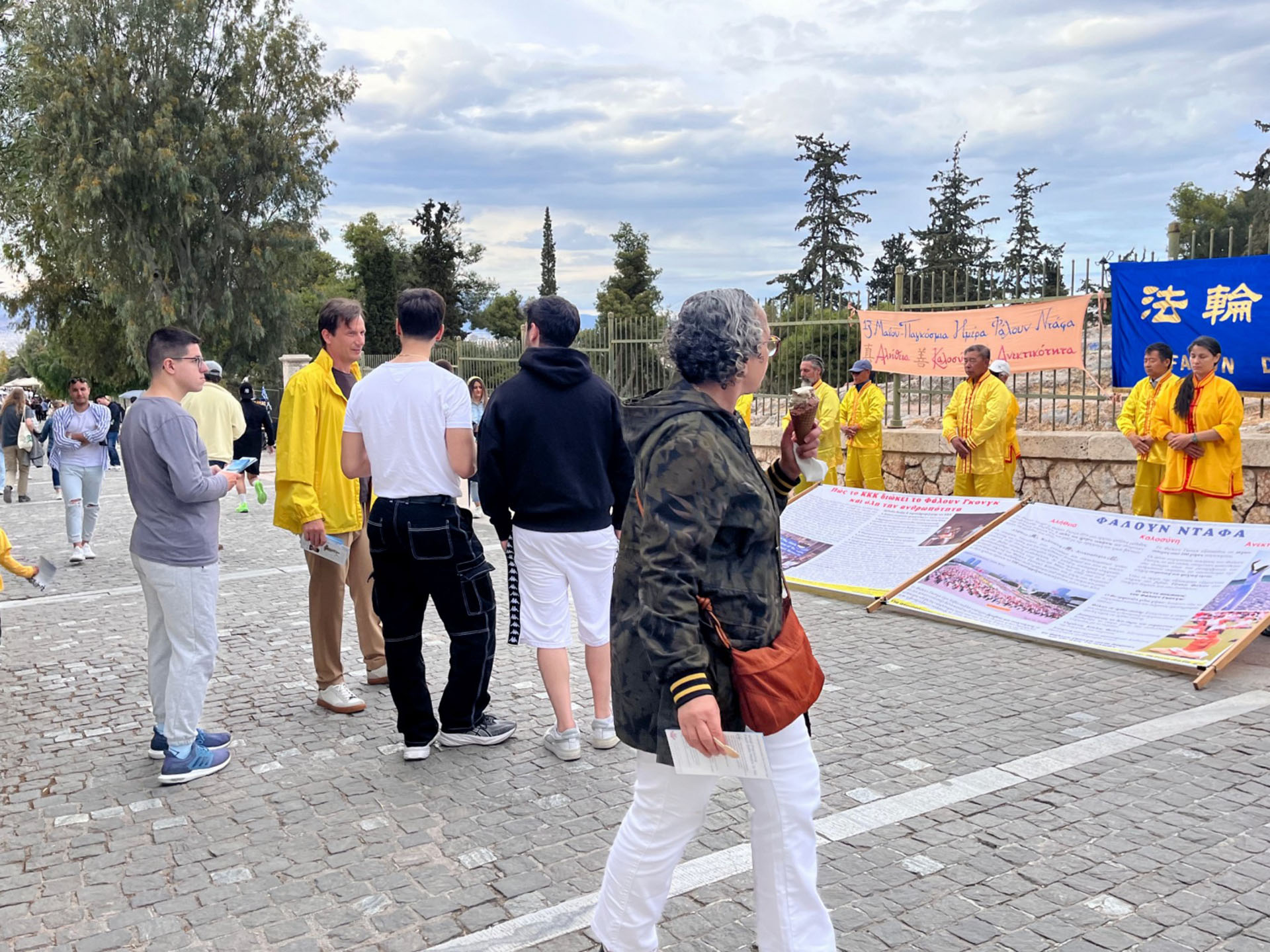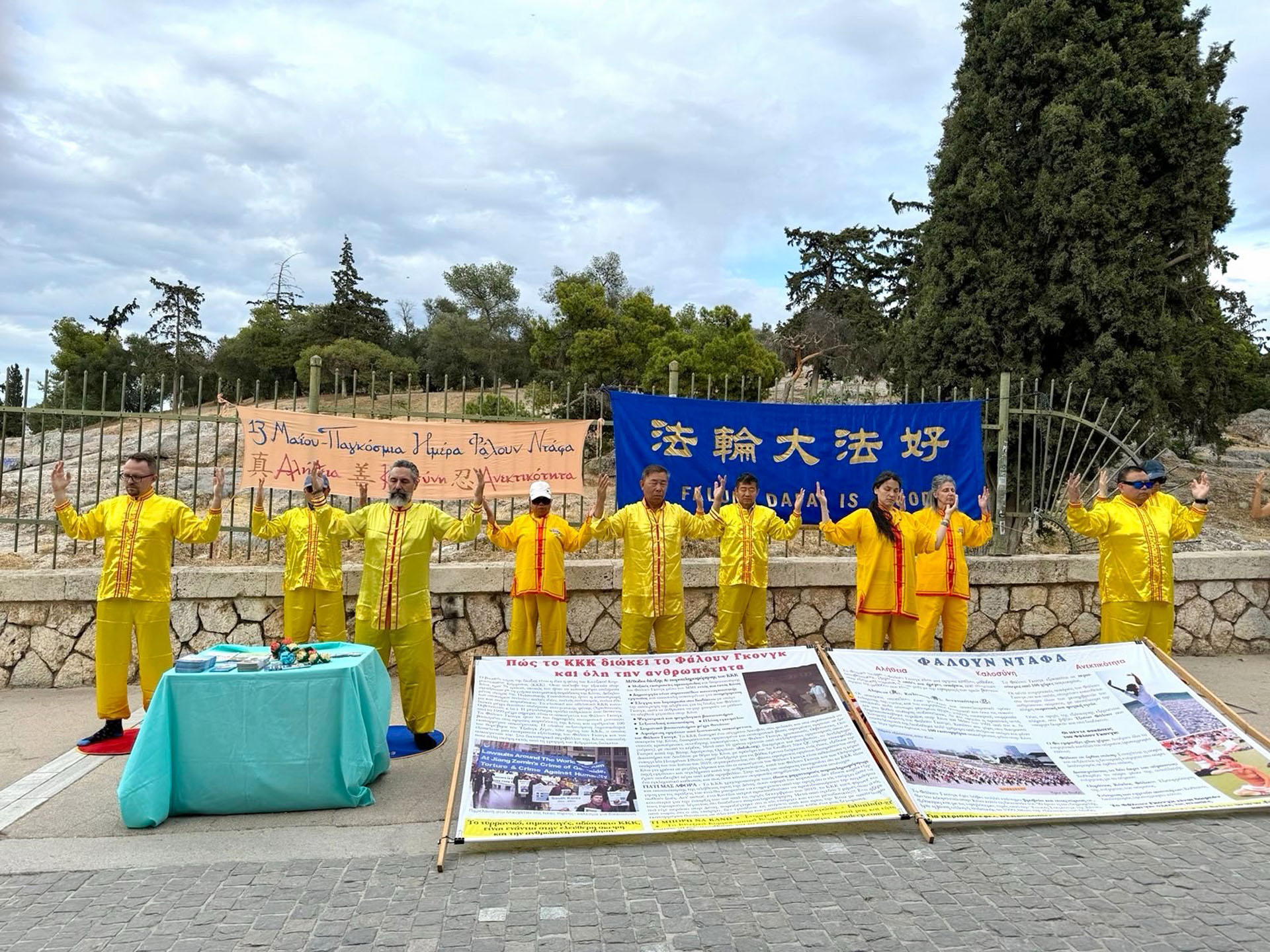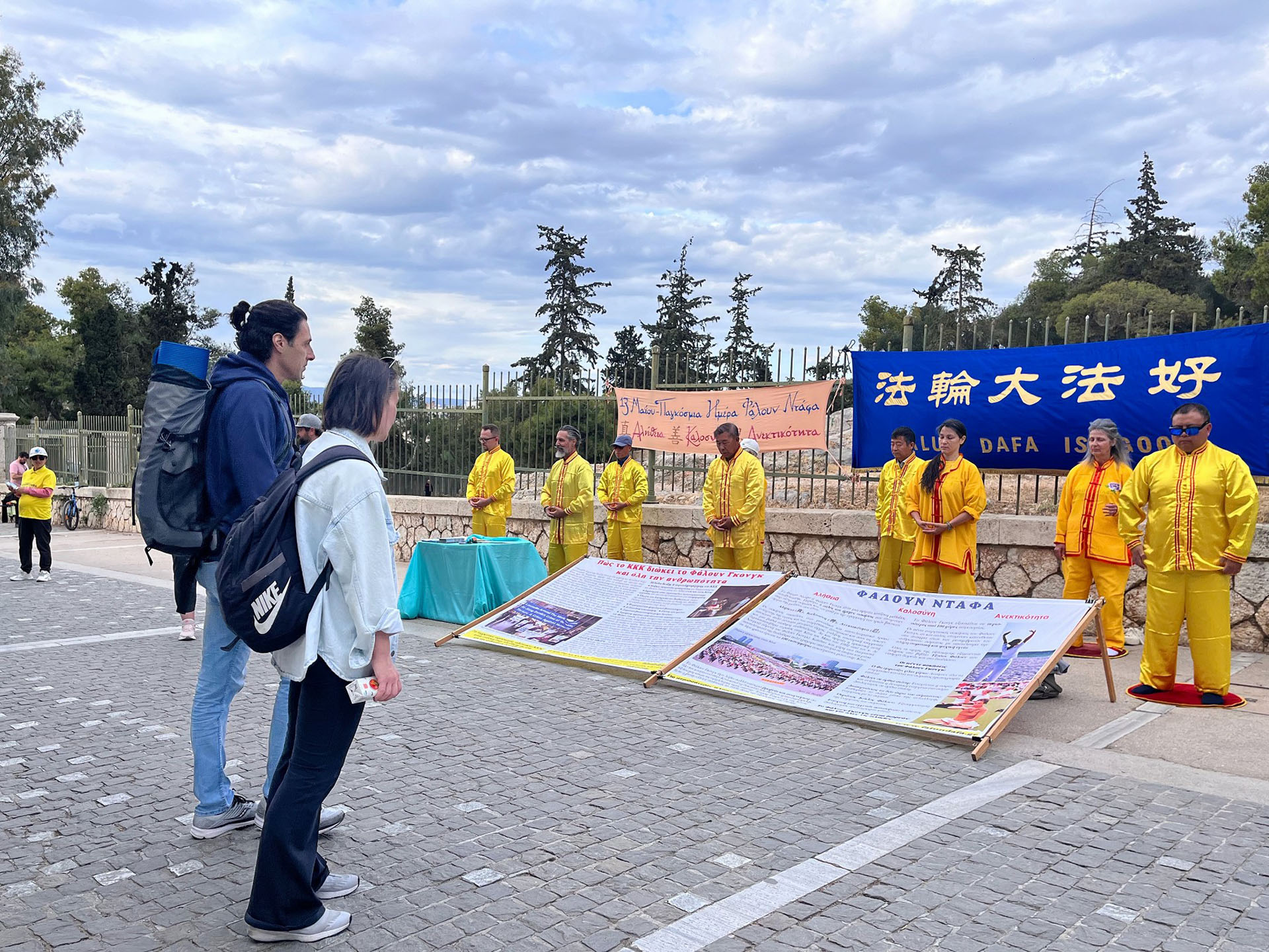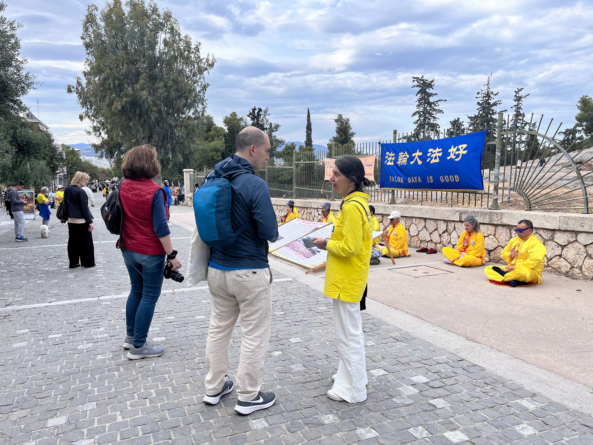 五月十一日,希腊人格里格力斯·佩利奥斯(Grigoris Pilios)在活动现场,跟着学员们的动作炼了法轮功的前四套功法。次日,他来到炼功点,学了第五套功法。格里格力斯告诉学员:“我感到了身心和谐。”
