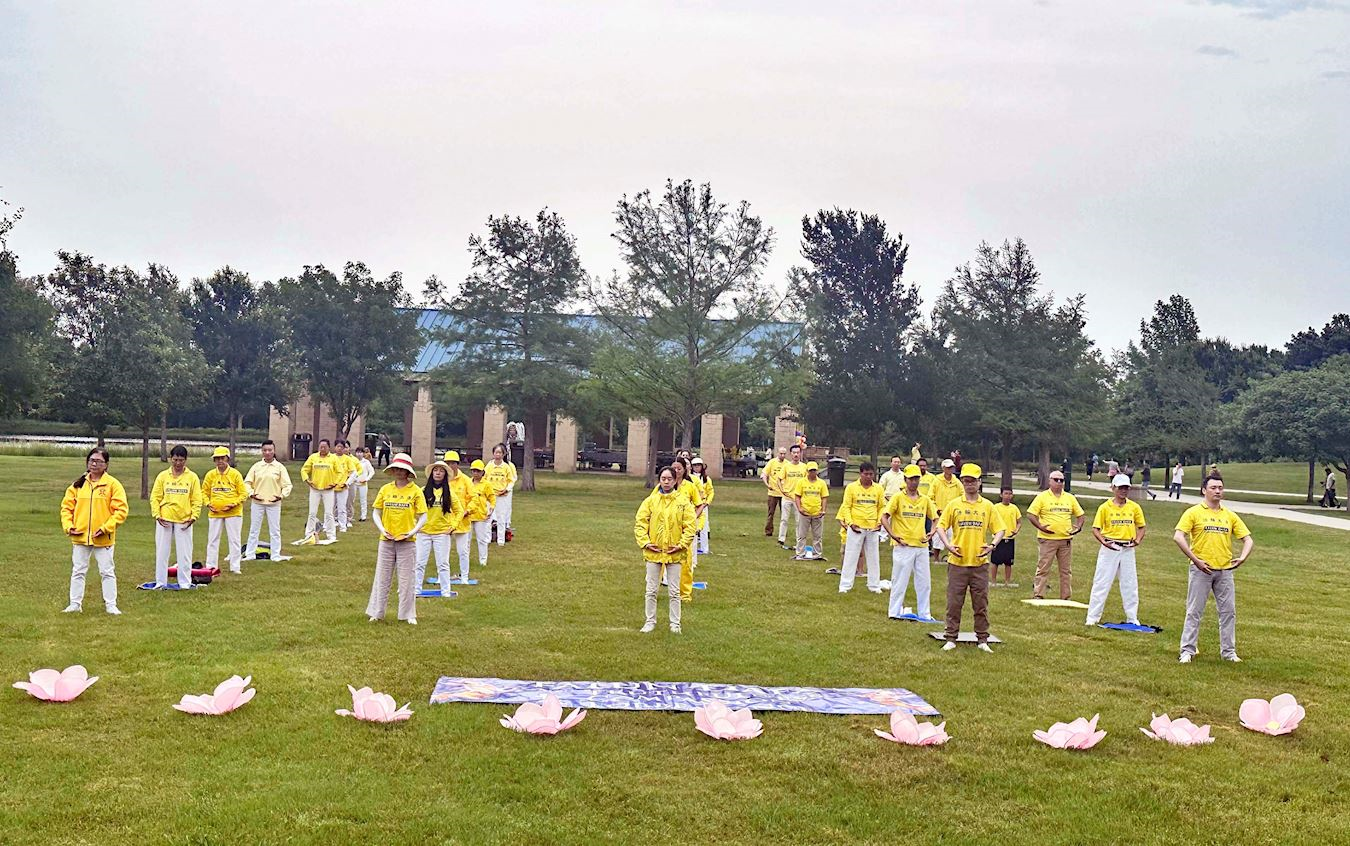 当天,两位女士对法轮功感兴趣,特地赶来现场学炼功法。