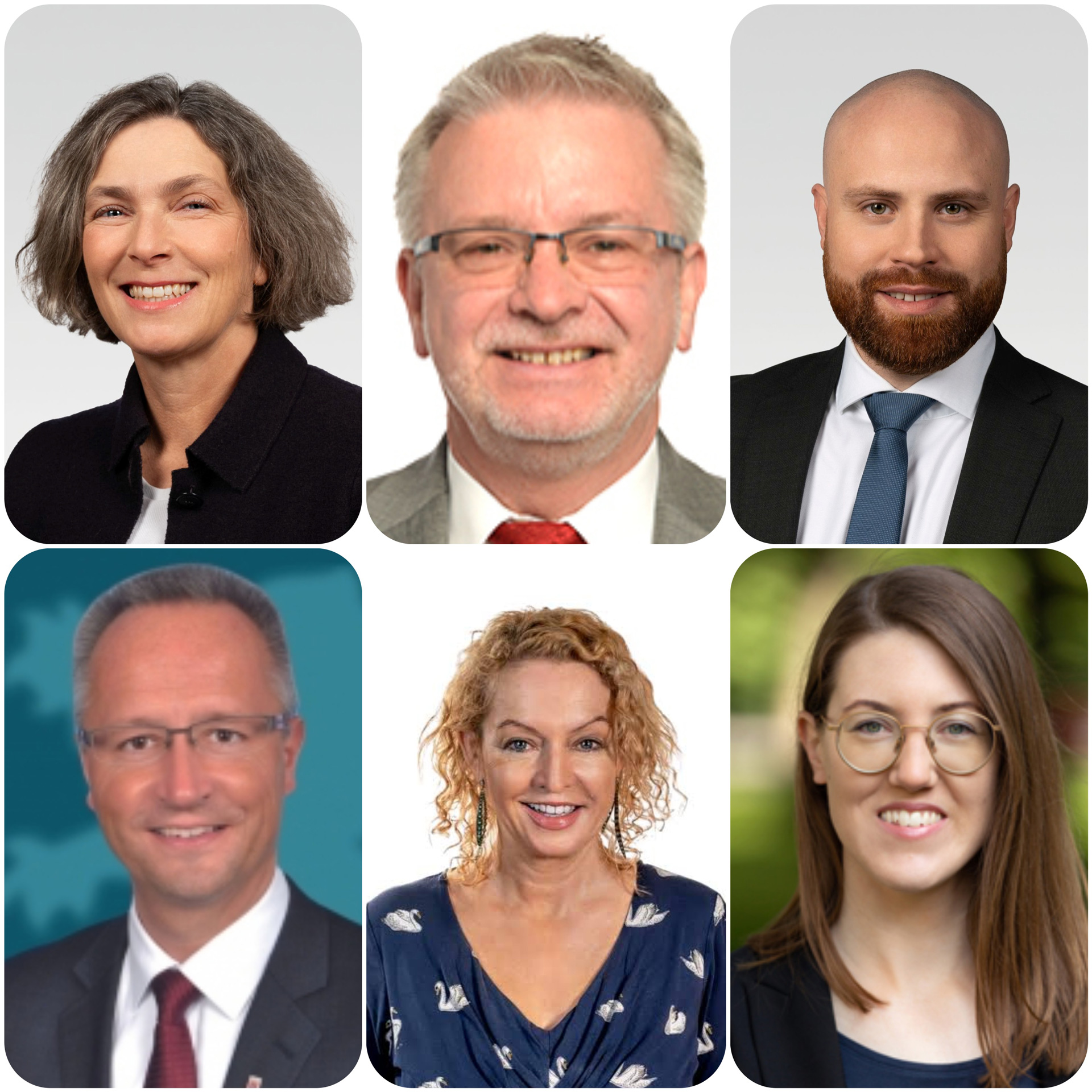 下排(从左至右)黑森州州基民盟(CDU)议员海科・卡塞克特(Heiko Kasseckert)、黑森州议会绿党(Die GRÜNEN)议员玛蒂娜-费尔德迈尔(Martina Feldmayer)和黑森州议会绿党(Die GRÜNEN)议员米丽娅姆-达尔克(Miriam Dahlke)