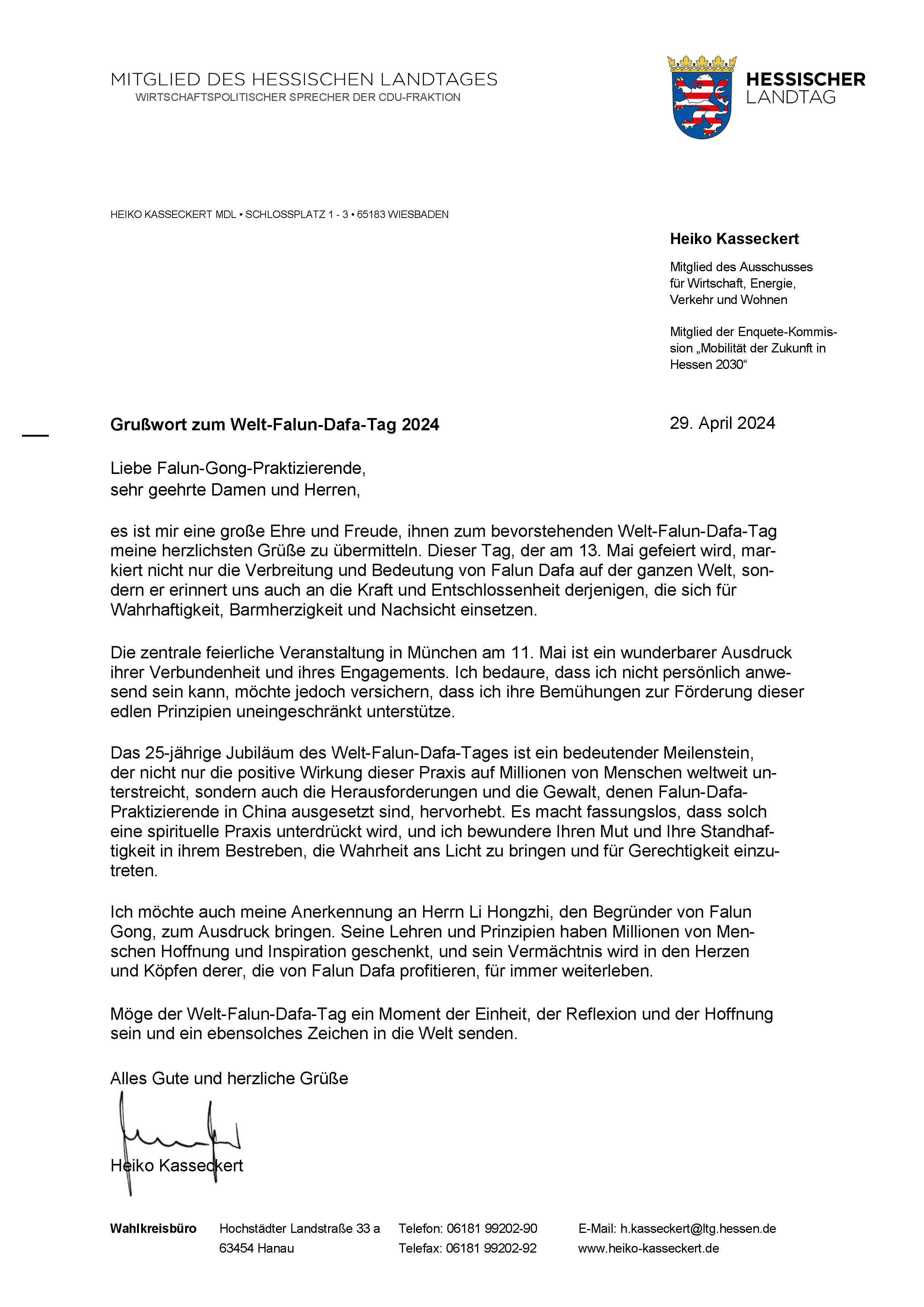 黑森州州基民盟(CDU)议员海科・卡塞克特(Heiko Kasseckert)的贺词译文: