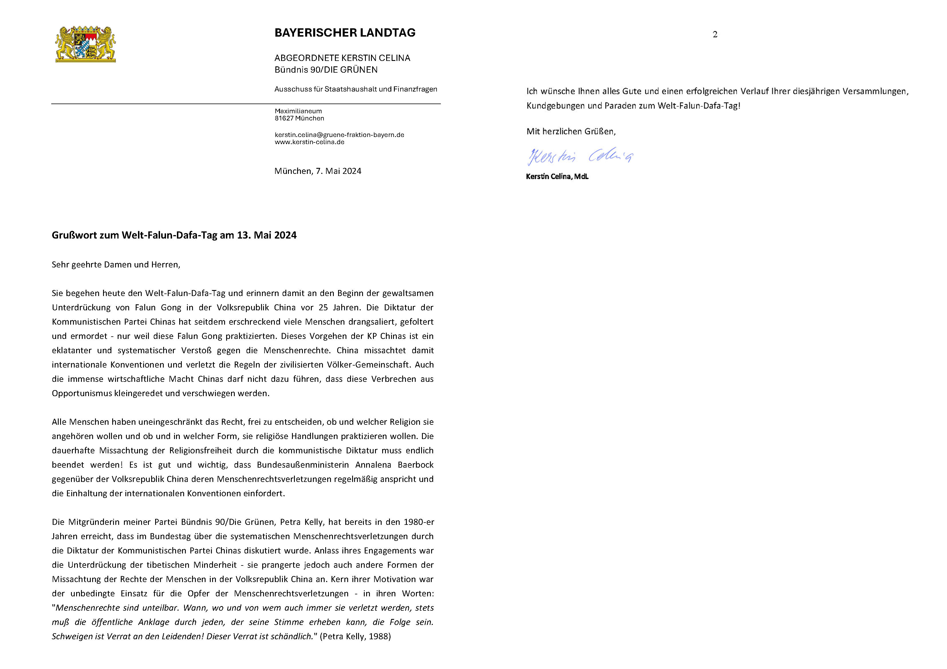 “世界法轮大法日”这一天,我们在慕尼黑以游行、展示功法和咨询台等和平方式庆祝这一节日,同时告诉大家中共对法轮大法修炼者的迫害已持续了二十五年。我支持和声援所有勇敢、自信地坚持自己的信念和信仰的人们,他们的付出是我们社会生活多元化和保护人权的有力标志。非常感谢所有参与活动的法轮大法修炼者,并祝你们一切顺利!