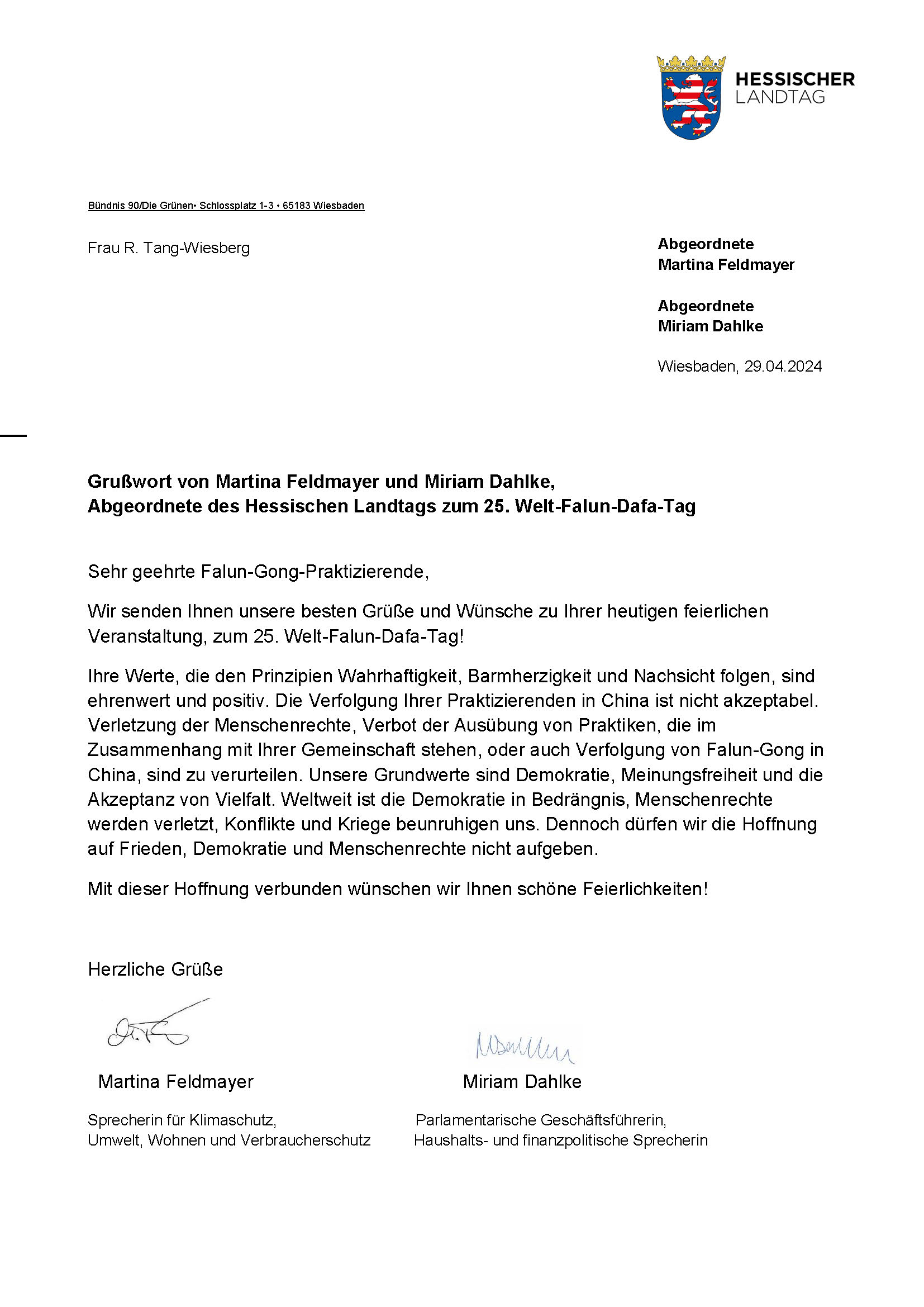 黑森州议会绿党(Die GRÜNEN)议员玛蒂娜-费尔德迈尔(Martina Feldmayer)和绿党(Die GRÜNEN)议员米丽娅姆-达尔克(Miriam Dahlke)的贺信译文: