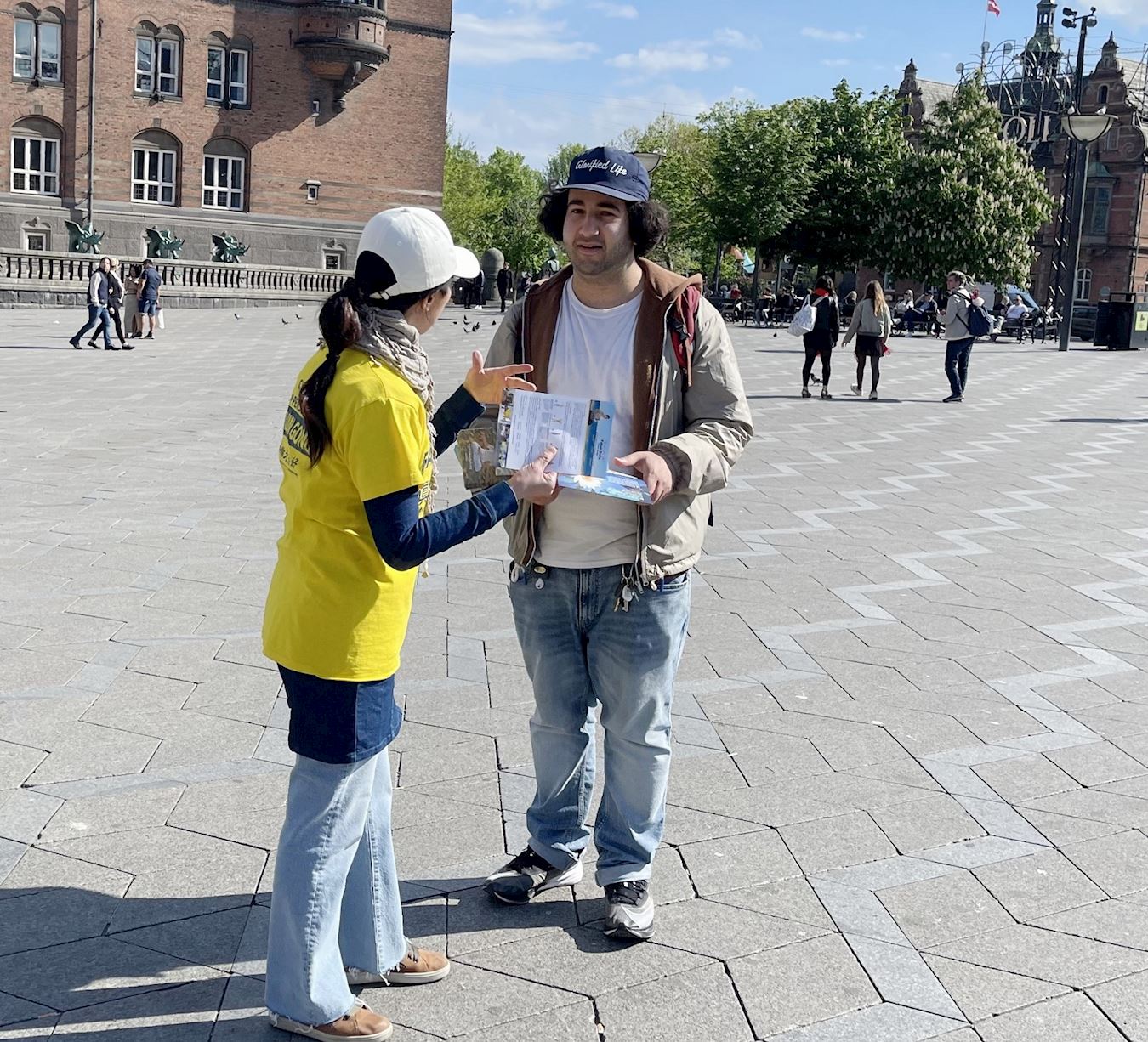 一位年轻的丹麦学生路过法轮功的活动地点时,好奇的询问学员,学员向他介绍了什么是法轮功,并且递给他资料时,告诉他法轮功学员是按真、善、忍的準則修炼。他很认同。并表示回去后会好好阅读法轮功的真相资料。
