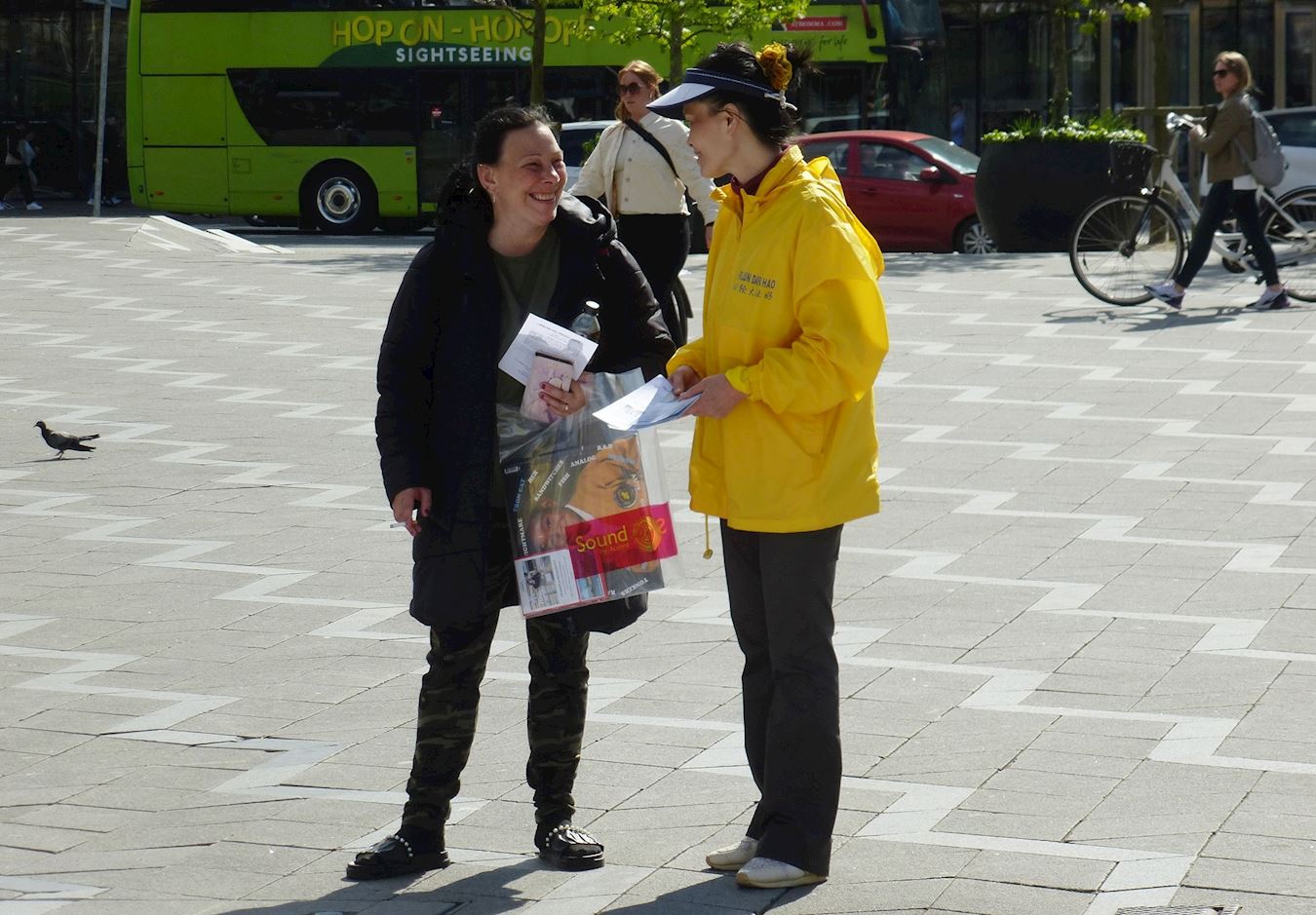 一位刚完成购物的女士,路过市政厅广场,遇到法轮功学员向她介绍法轮大法弘传世界三十二周年,法轮大法传入丹麦也有二十七年,使许多民众身心受益的真相后,她说:“今天知道了这么多信息,感到非常高兴。”感谢学员告诉她这些珍贵的讯息。