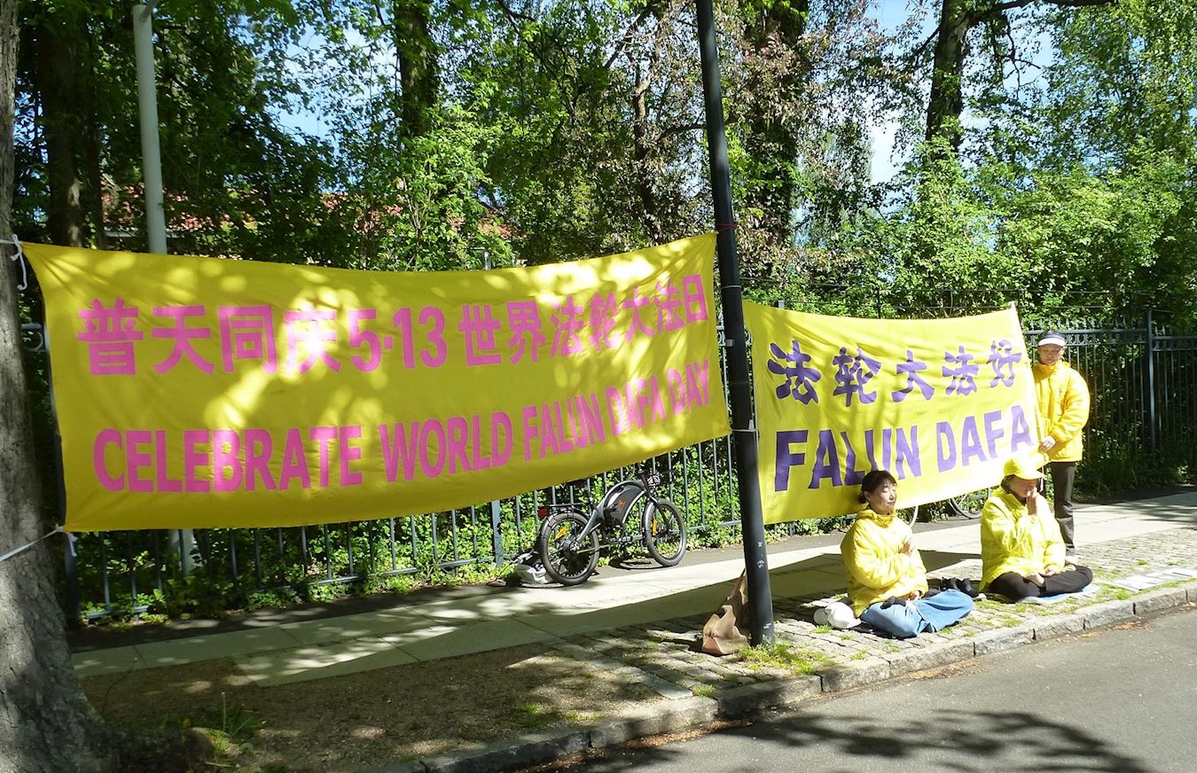 五月十三日,星期一,法轮大法日的当天上午,部分法轮功学员来到中共驻丹麦使馆前,拉开“普天同庆法轮大法日”与“法轮大法好”的横幅,向中使馆的工作人员传递真相。