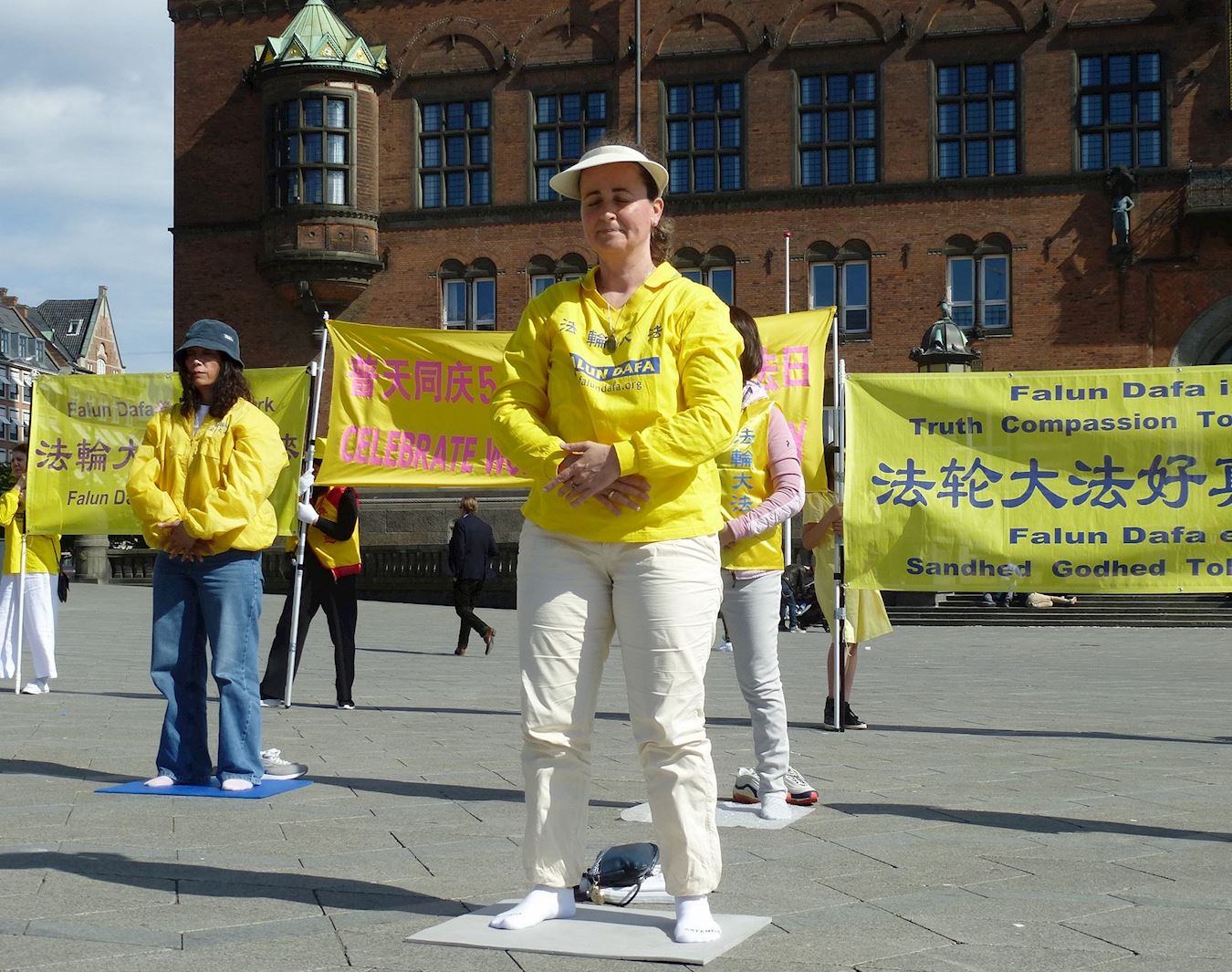 卡萝尔说:“我已经修炼法轮功二十五年了。自从修炼后,我懂得了人生的真正意义及做人的道理,处处按照真、善、忍准则来要求自己,做一个道德高尚的好人。从此我在工作中兢兢业业,得到上级与同事们的好评。在家庭中克尽自己为人妻、为人母的责任,使家庭和睦快乐。今天我专程来到哥本哈根,就是为了要向人们说一句我的心声:法轮大法好!感谢师父为我的生命带来了全新的意义。”