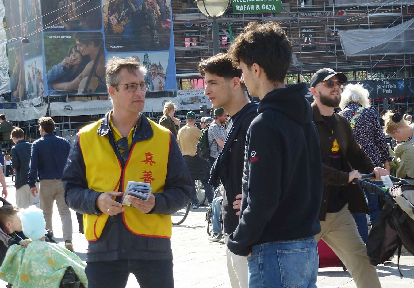 当他知道法轮功学员二十五年来努力坚持不懈的反迫害,和平理性的争取信仰自由的权利时,他说:“我可以加入你们吗?我也想穿上黄衣服,帮你们发资料。”学员表示欢迎后,建议他详细了解法轮功,从亲身学炼功法开始。直到学员帮他找到了网上的炼功音乐后,他神情愉快的离去。