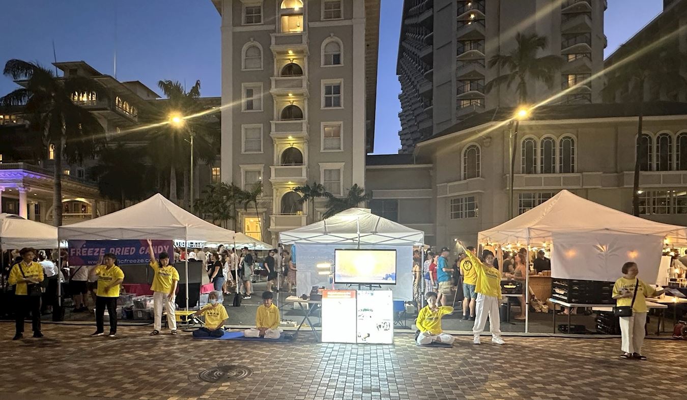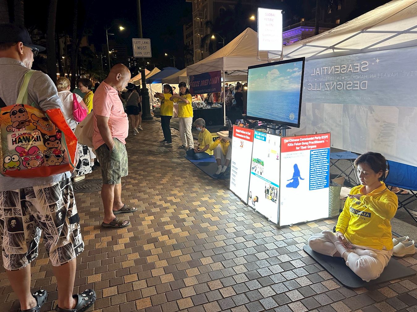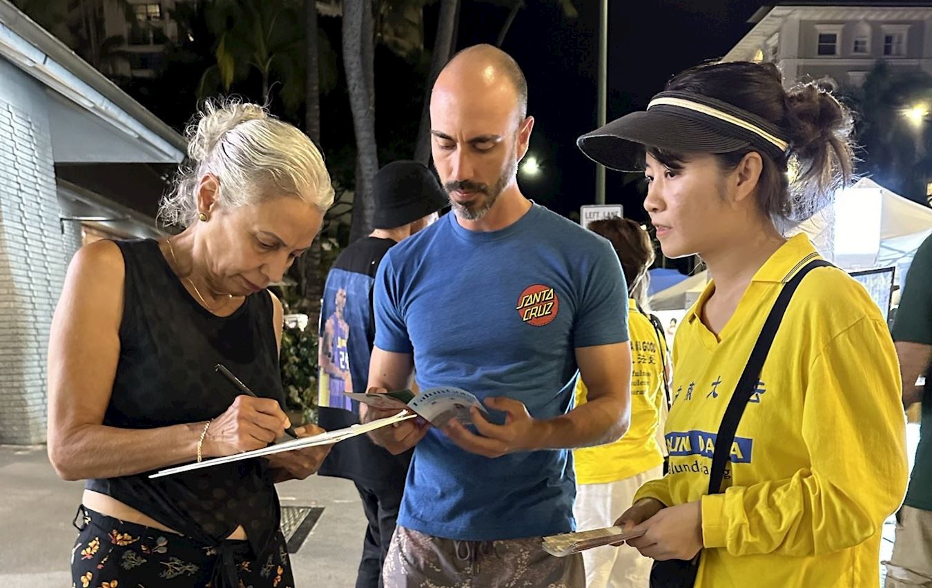 ![]() 图1:法轮功学员在夏威夷著名的威基基(Waikiki)景区弘法,征集反迫害签名 |