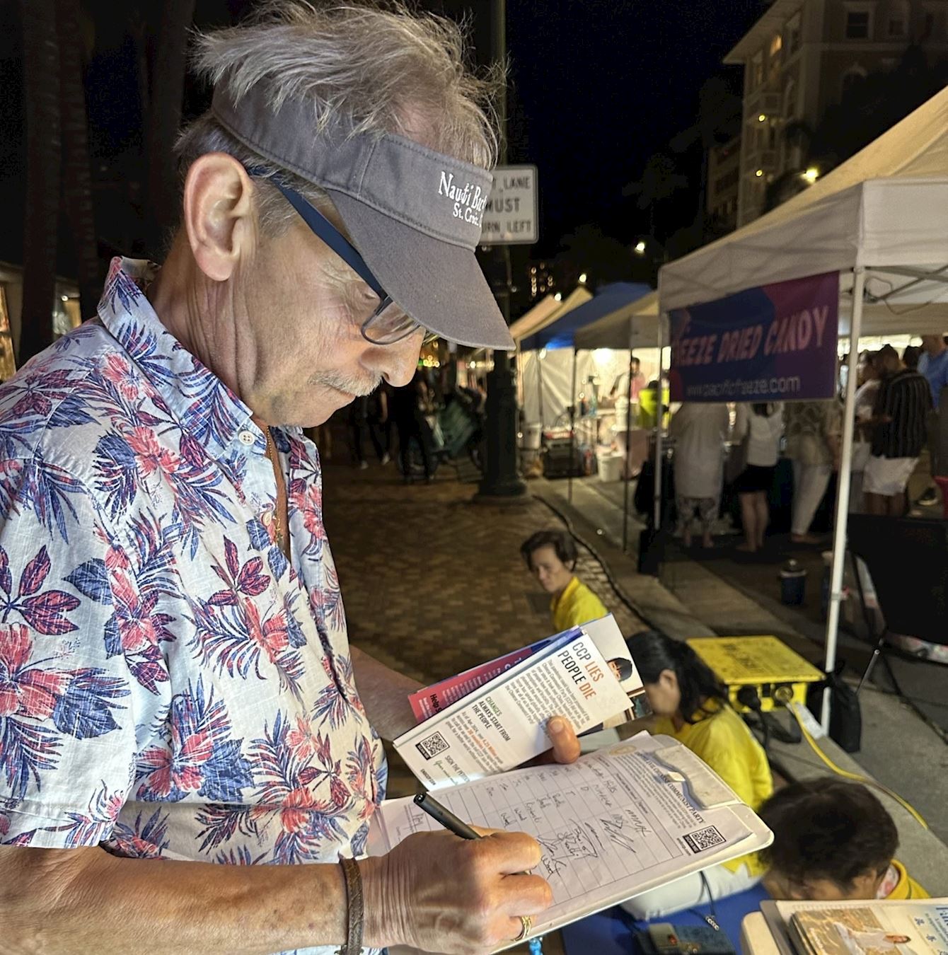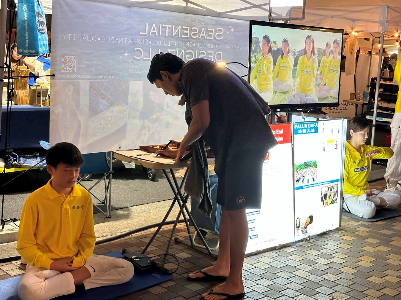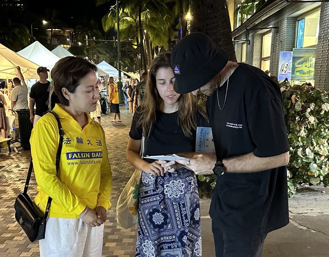 另外一位住在夏威夷,不愿透露姓名的中国女士一来就询问如何在当地学炼法轮功的情况。她说她经常要回国,在中共邪恶的专制制度下,自己不方便暴露身份,但是她表示她知道法轮功真相,知道法轮功学员都是好人,她很认同法轮功真、善、忍的理念,自己早就想学了。