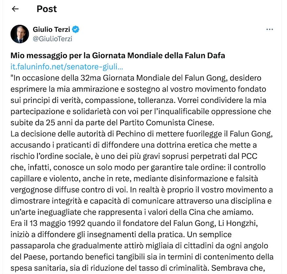 一、前外交部长、大使,现参议员朱利奥·特尔齐(Giulio Terzi)先生也在推特上发帖,表达对法轮功的支持。