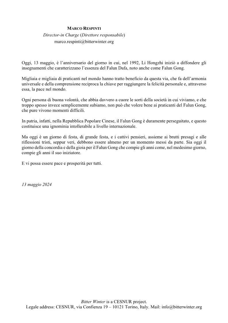 四、宗教自由与人权杂志《苦冬-Bitter Winter》主编马可·雷辛提(Marco Respinti)发来贺信,向“正处于困难时期的法轮功学员”表达关爱。