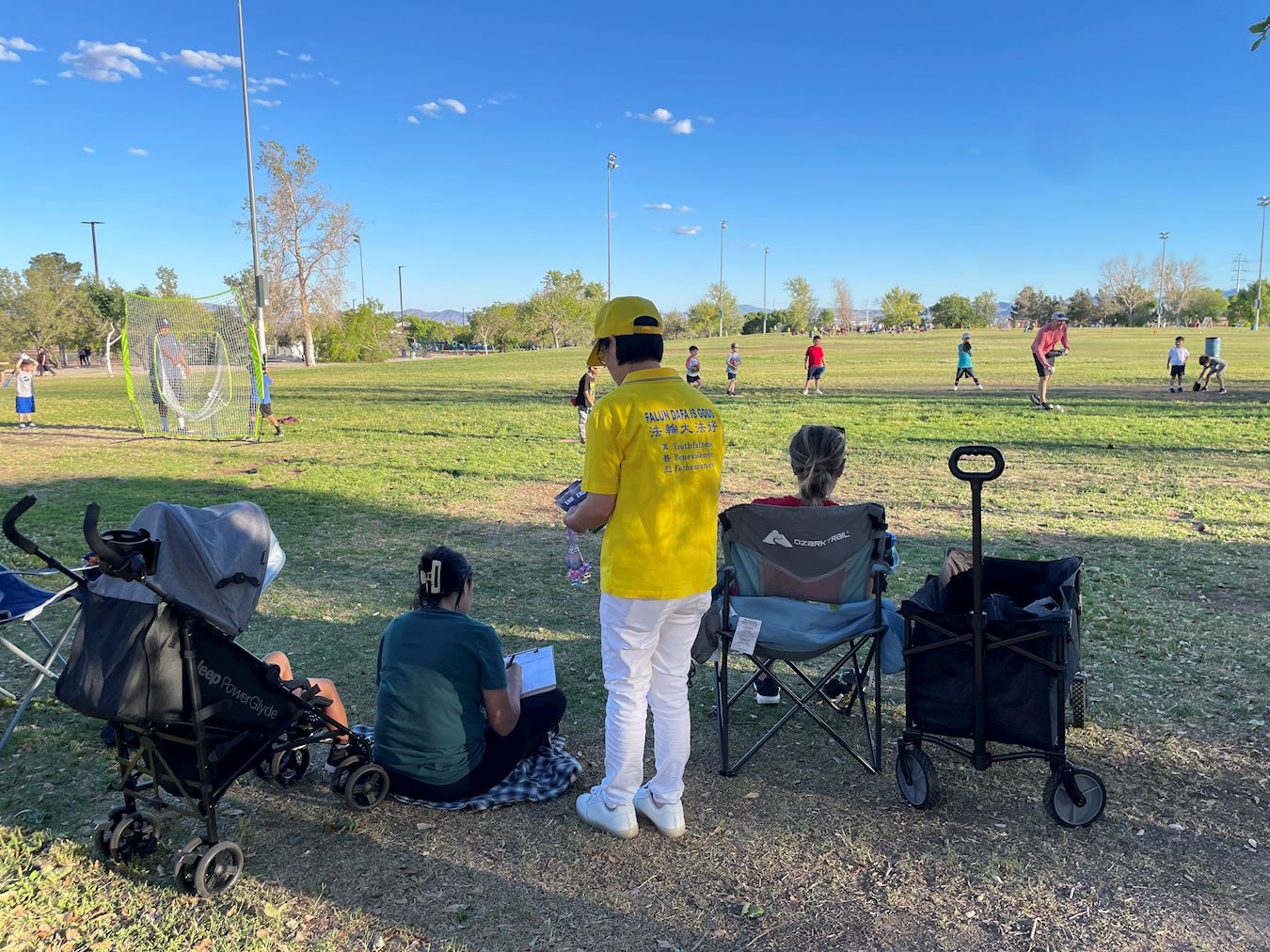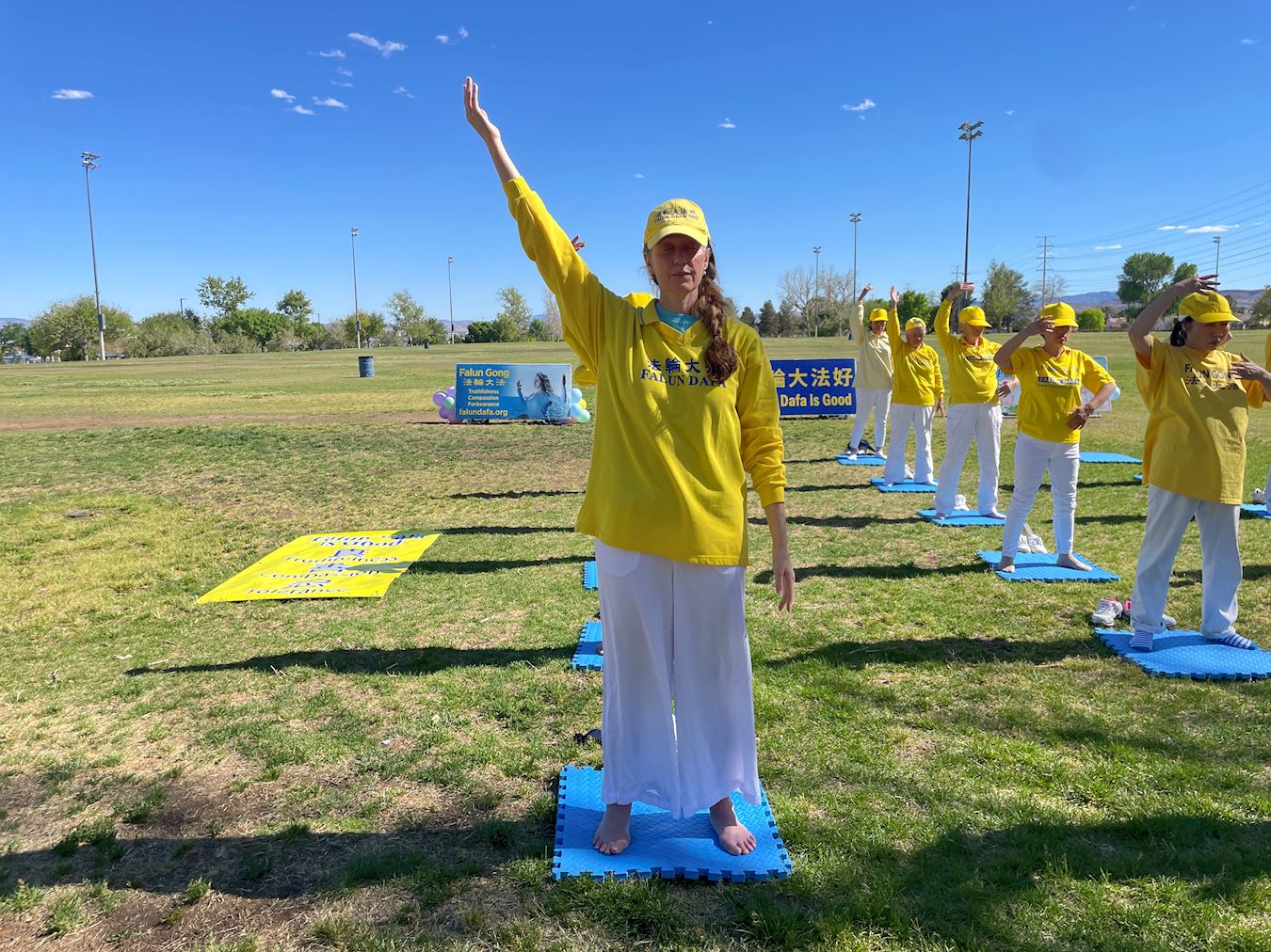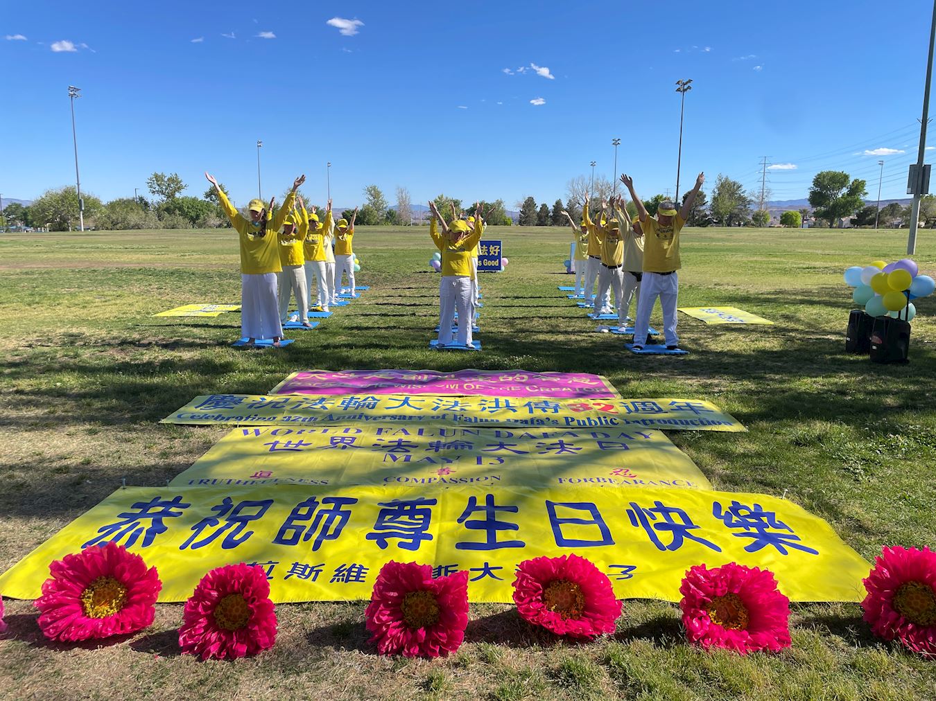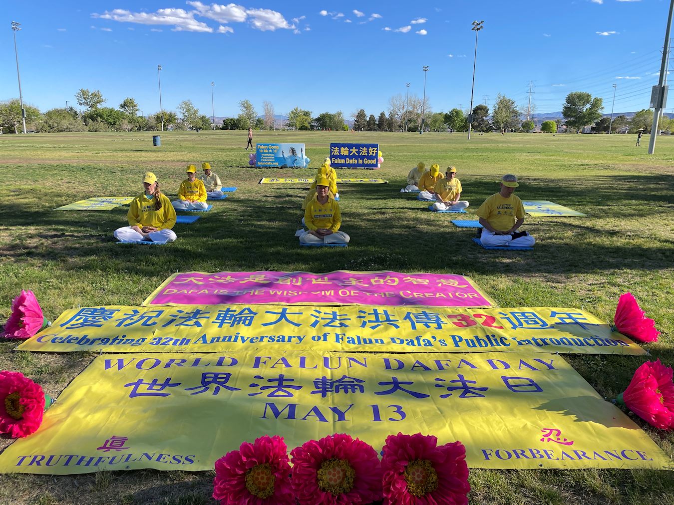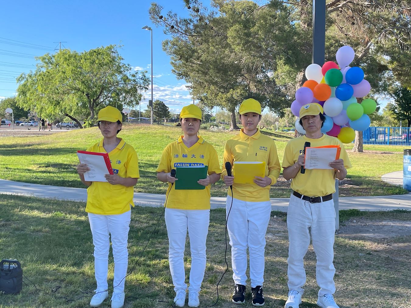 初夏的天空蔚蓝明澈如湖水,映衬着朵朵白云,清风拂面。沙漠微风公园里似乎也洋溢着一种快乐祥和的节日气氛。当天下午,当地的法轮功学员用展板、条幅和莲花布置了活动的现场,并吹起了很多彩色的氢气球,使现场更显有节日的氛围。