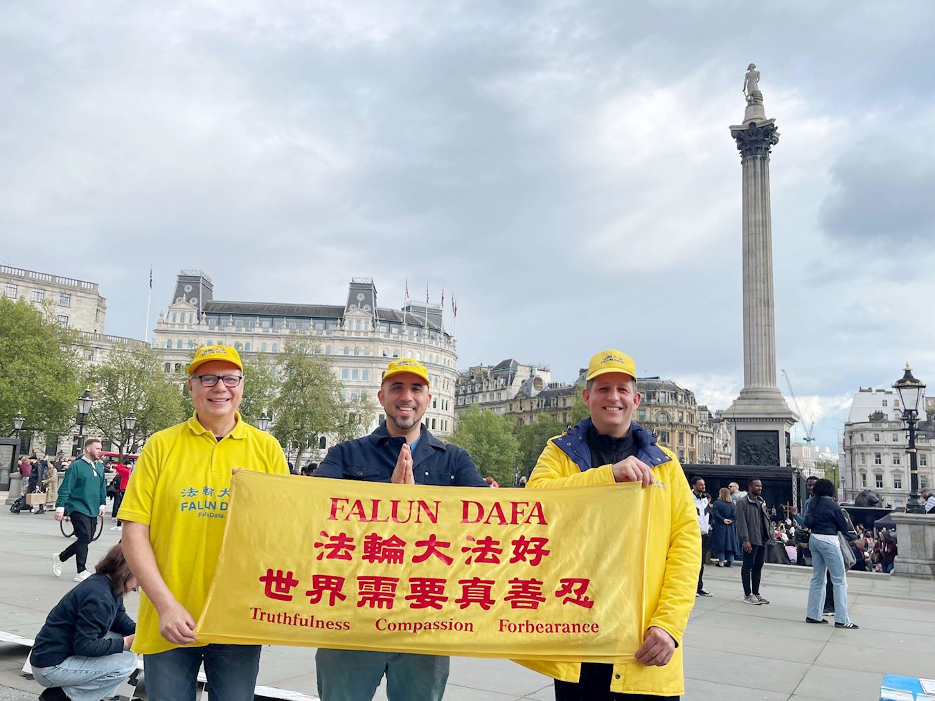 他和妻子有空时到伦敦的医院看望和关怀癌症病人。他还参加公园集体炼功弘法,周末在游人如织的国家画廊前的鸽子广场,他展示法轮功功法和告诉人们法轮大法好。