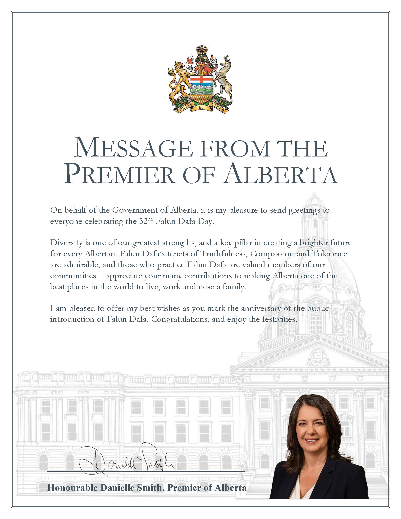 亚省省长丹尼尔·史密斯(Danielle Smith)“很高兴代表亚伯塔省政府向庆祝法轮大法日的每个人致以问候!”