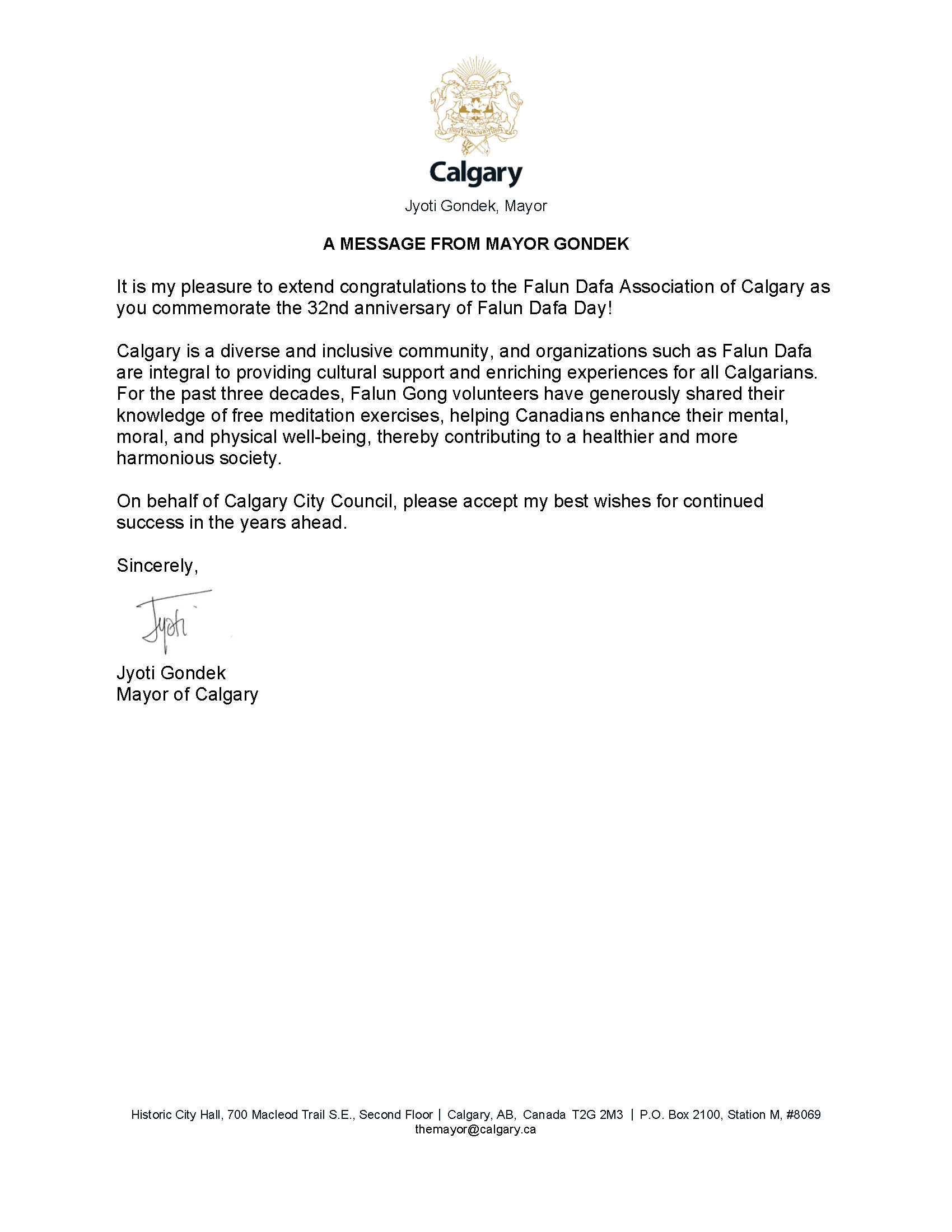 亚省第一大城──卡尔加里市长乔蒂·贡德克(Jyoti Gondek)首先恭贺,“值此法轮大法弘传三十二周年之际,我谨向卡尔加里法轮大法学会表示祝贺!”