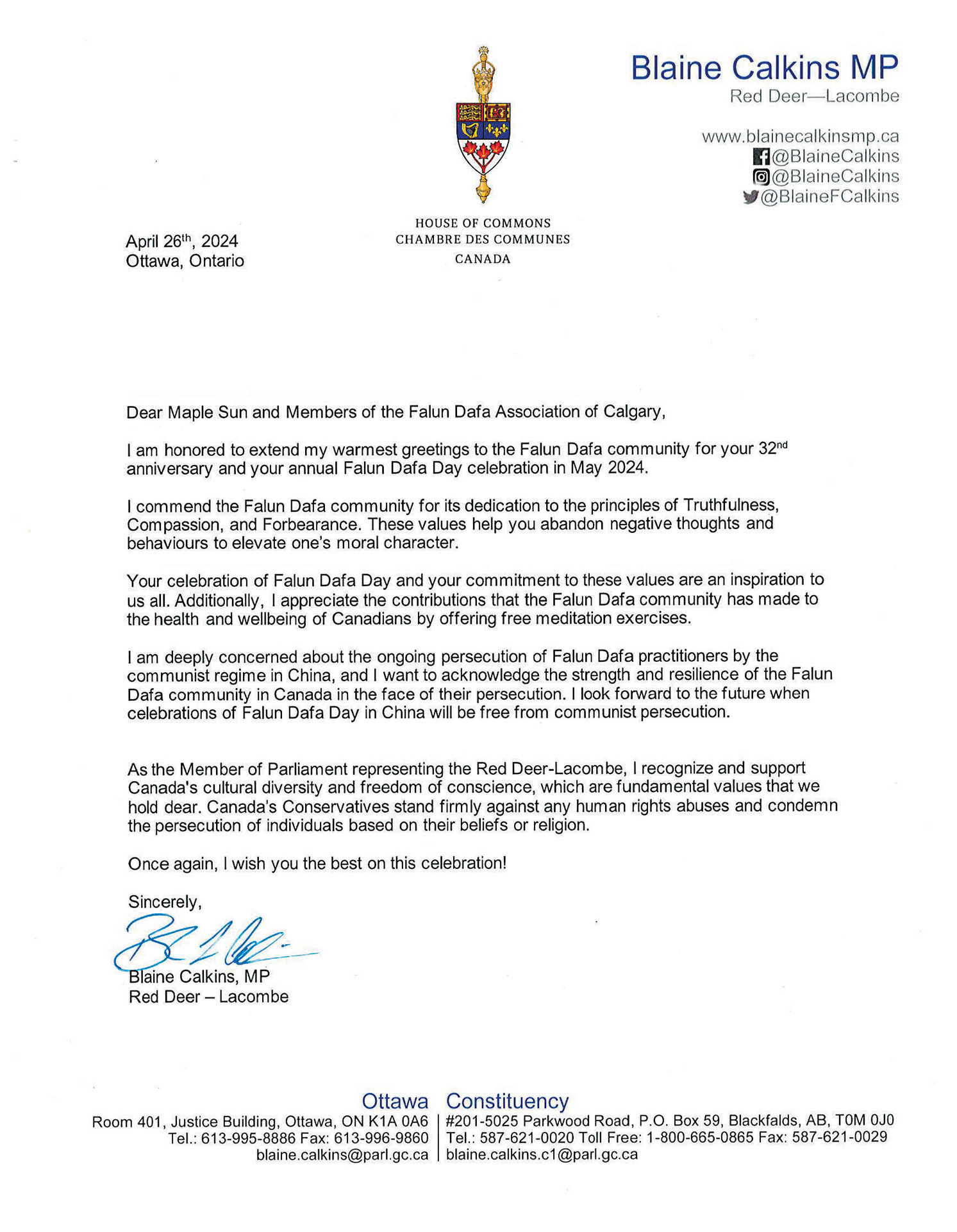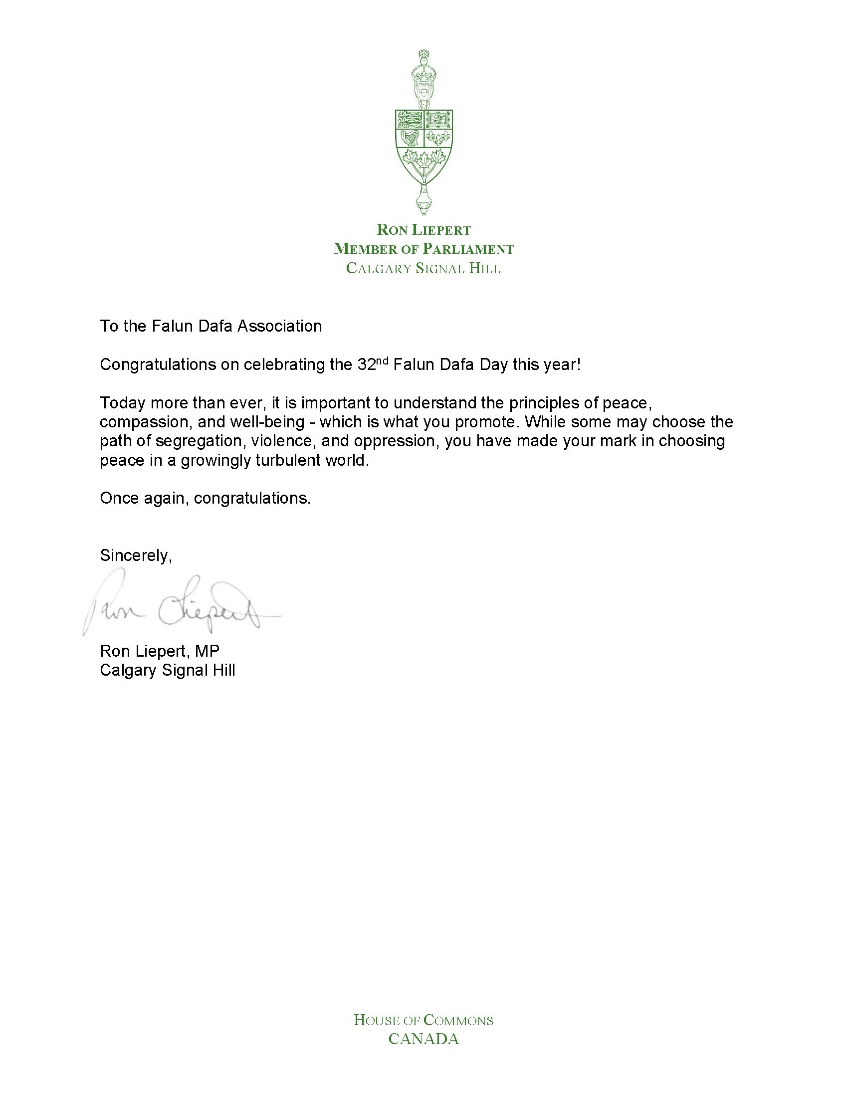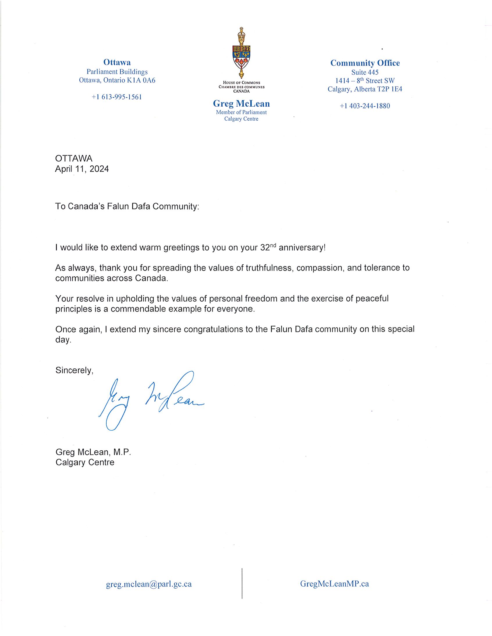 卡尔加里中心选区国会议员格雷格·麦克莱恩(Greg McLean)在信函中表达了他的感激之情,他写道:“一如既往,感谢你们向加拿大各社区传播真、善、忍的价值观。你们坚决维护个人自由,并践行和平原则,是给每个人树立的值得赞扬的榜样。”