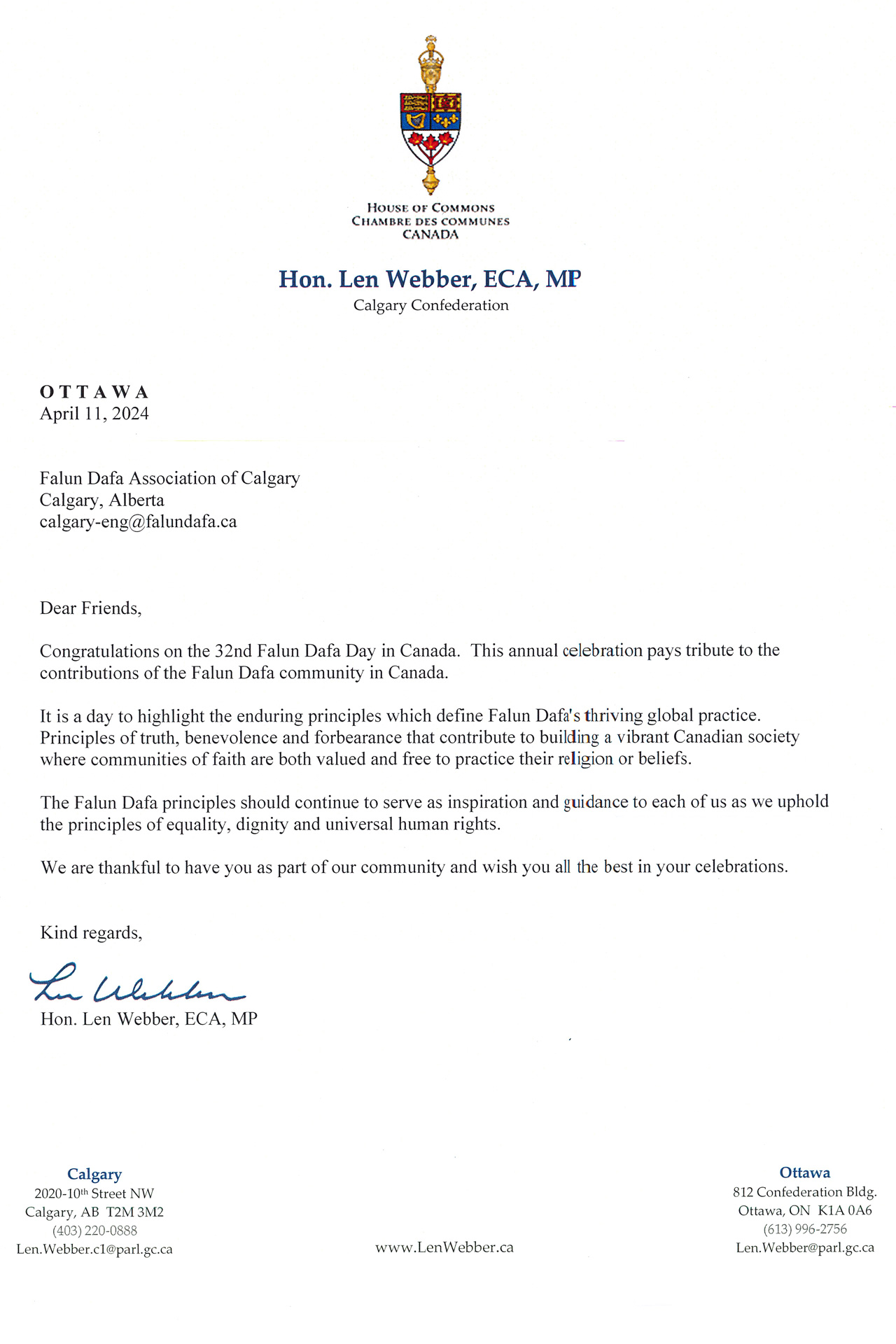 卡尔加里Confederation选区国会议员莱恩·韦伯(Len Webber)盛赞:“这个一年一度的庆祝活动彰显了法轮大法团体的贡献。这一天让法轮大法在全球蓬勃发展的真、善、忍原理引人注目,此原理有助于建设一个充满活力的加拿大社会,让信仰团体受到重视并可以自由地实践自己的信仰。”