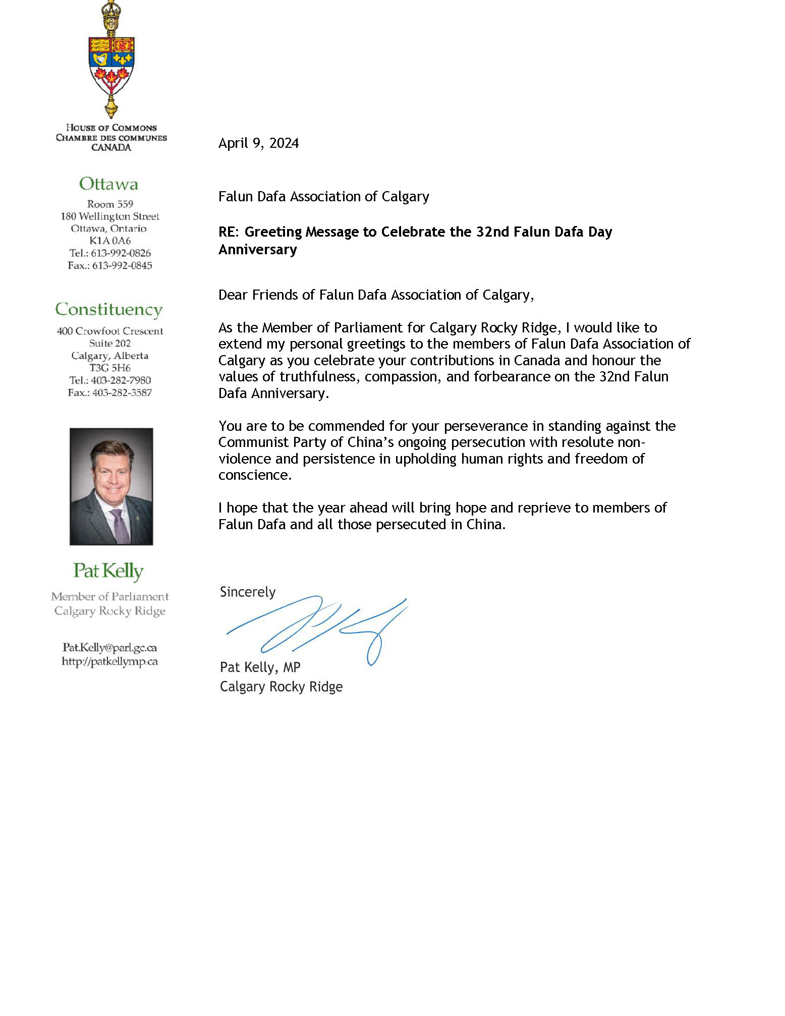 卡尔加里Rocky Ridge选区国会议员、联邦影子内阁部长帕特·凯利(Pat Kelly)表示:“当你们庆祝对加拿大的贡献,弘扬真、善、忍的价值观时,我谨向卡尔加里法轮大法团体致以个人问候!”
