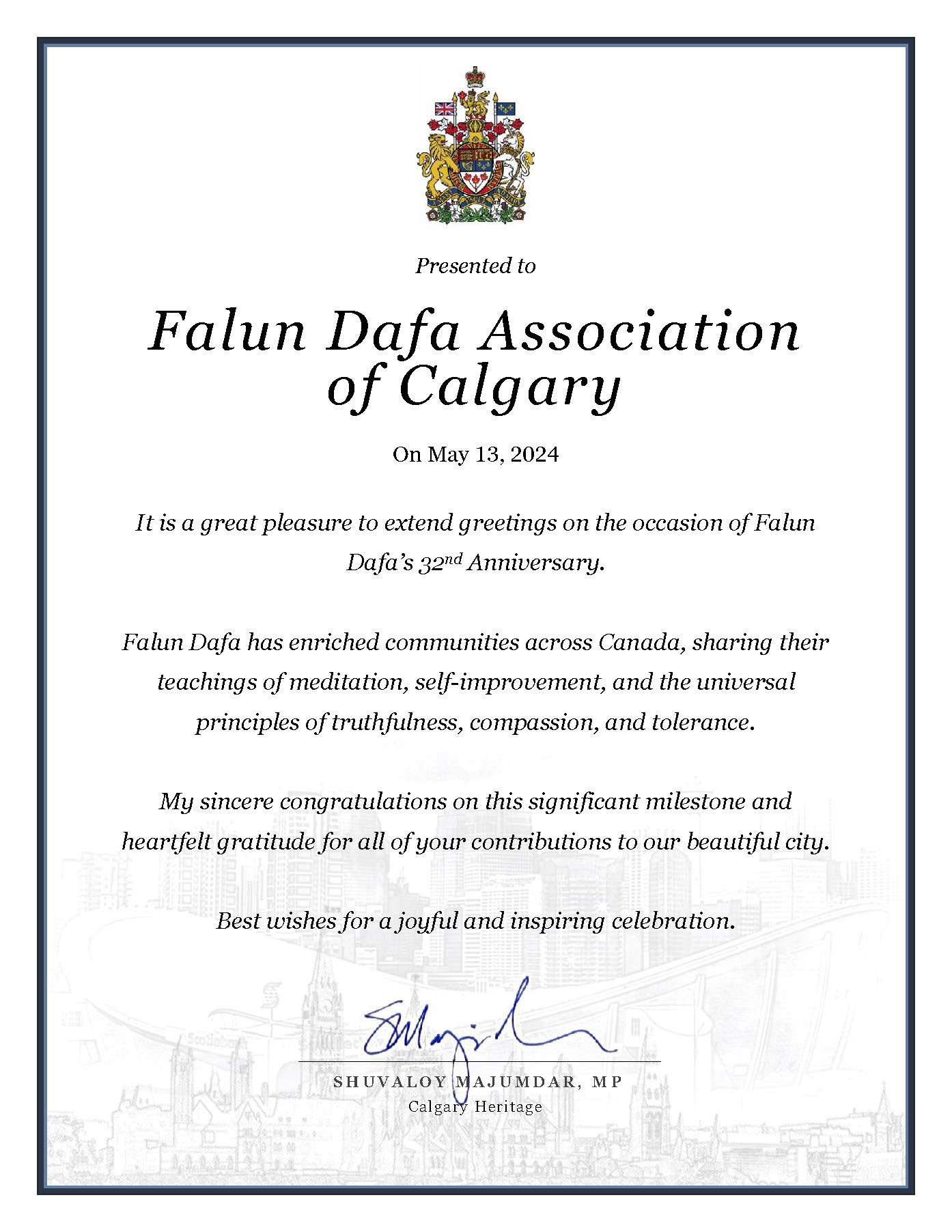 卡尔加里Heritage选区国会议员马穹达尔(Shuvaloy Majumdar)表示:“很高兴在法轮大法弘传三十二周年之际向大家致以诚挚的问候。”
