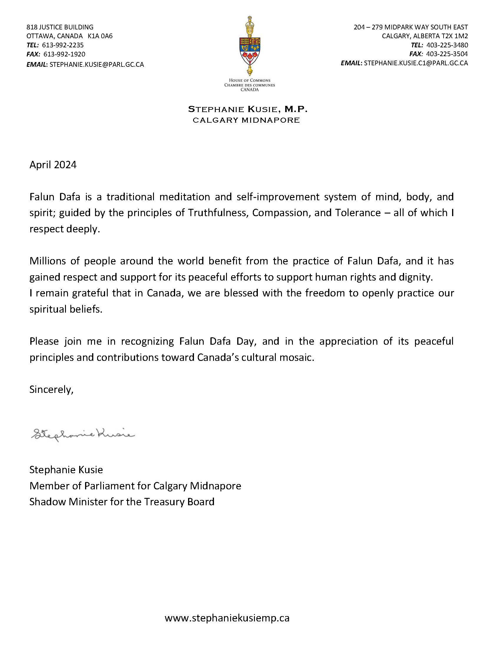 卡尔加里Midnapore选区国会议员、联邦影子内阁部长斯蒂夫尼·库西(Stephanie Kusie)表达了自己的敬意:“法轮大法是一种传统的打坐和自我完善身、心、灵的体系,以真、善、忍的原理为指导——我深深尊重这些原理。”