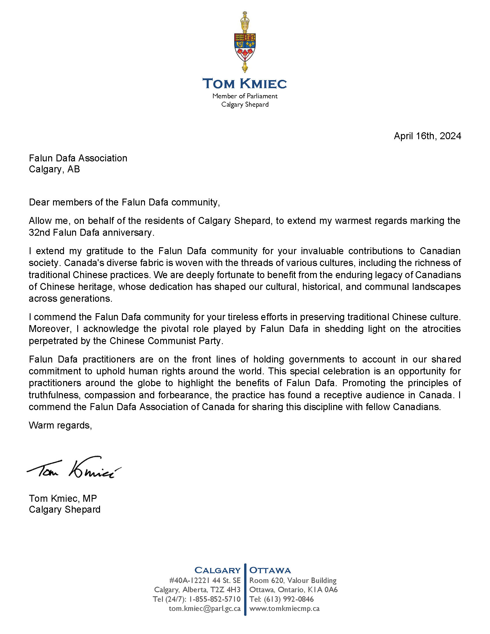 卡尔加里Shepard选区国会议员、联邦影子内阁部长汤姆·克米克(Tom Kmiec)在贺信中多次感谢法轮大法,“我对法轮大法团体为加拿大社会做出的宝贵贡献表示感谢。加拿大的多元化由各种文化交织而成,其中包括丰富的中国传统文化。我们非常幸运能够受益于加拿大华裔带来的悠久文化,他们的奉献精神塑造了我们几代人的文化、历史和社区景观。”