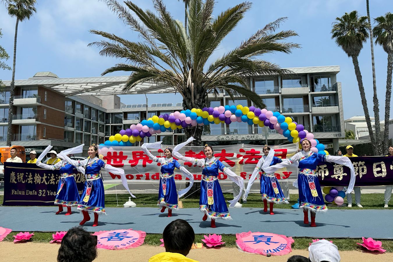 ![]() 图8~9:洛杉矶法轮功学员载歌载舞欢庆世界法轮大法日 |