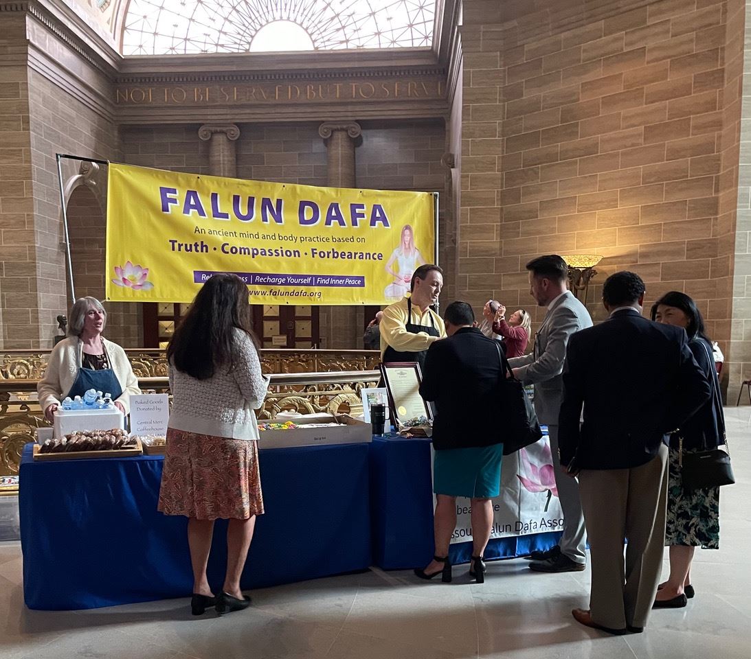![]() 图2:插入照片2024年5月7日,议员们和参观者在密苏里州参众议院投票厅附近的圆形大厅参加世界法轮大法日招待会。 |