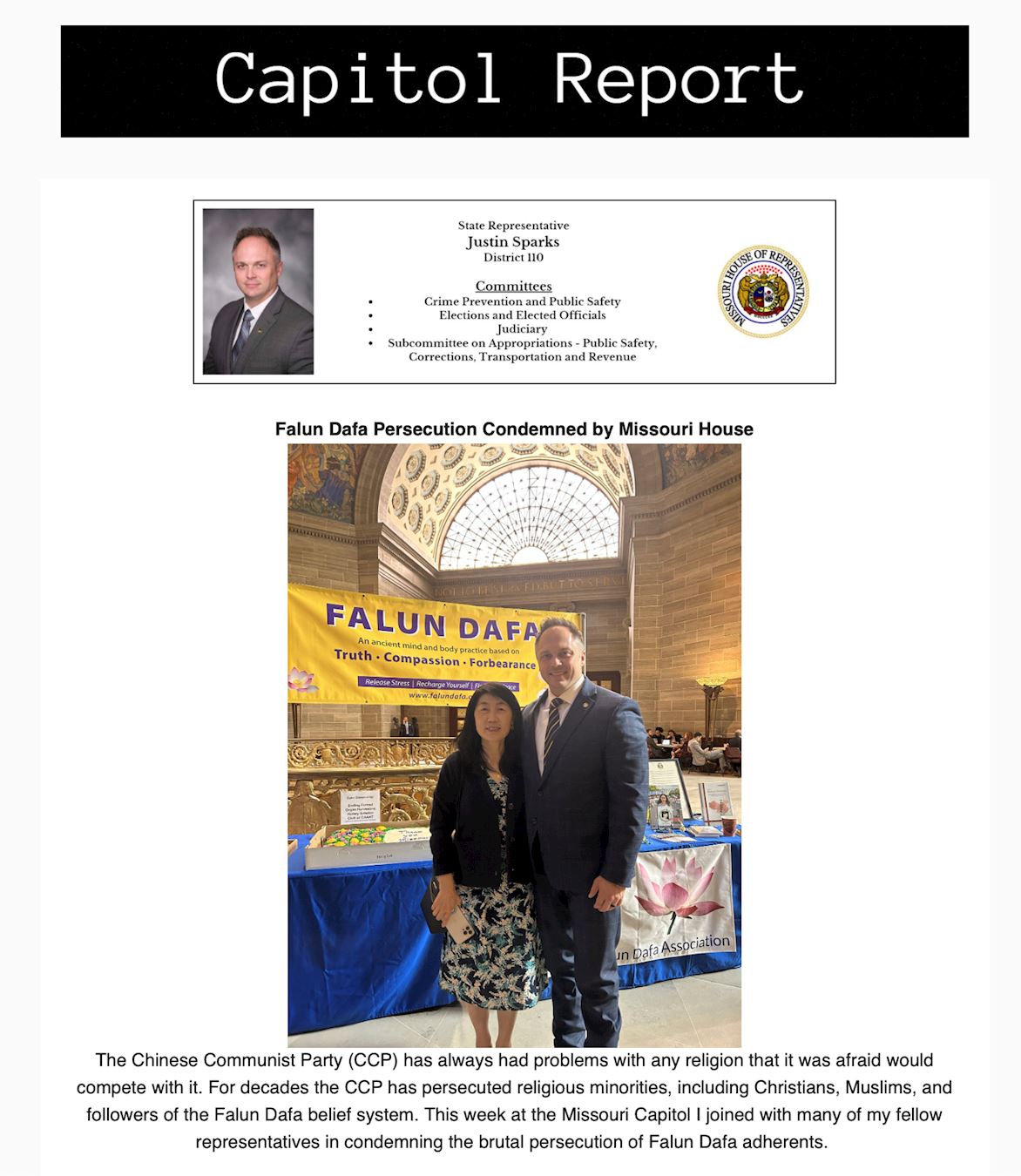![]() 图3:众议员贾斯汀·斯帕克斯(Justin Sparks)的新闻简报截图,他在参加招待会后也共同发起了世界法轮大法日决议。 |