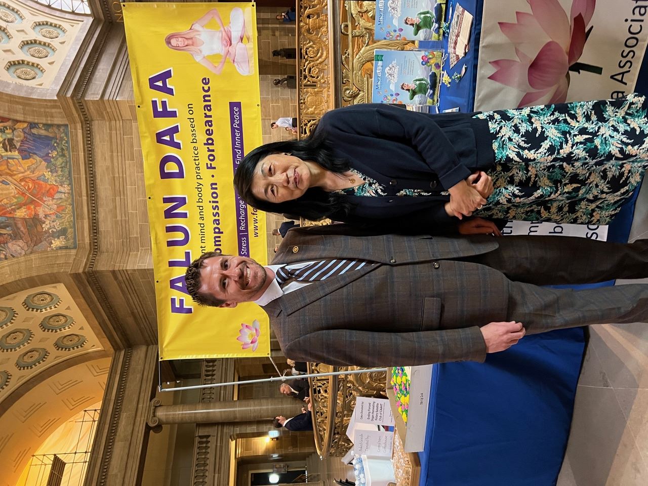 ![]() 图4:参议员安德鲁·柯尼希(Andrew Koenig)出席了世界法轮大法日招待会,并会见了他的选民田开荣女士。 |