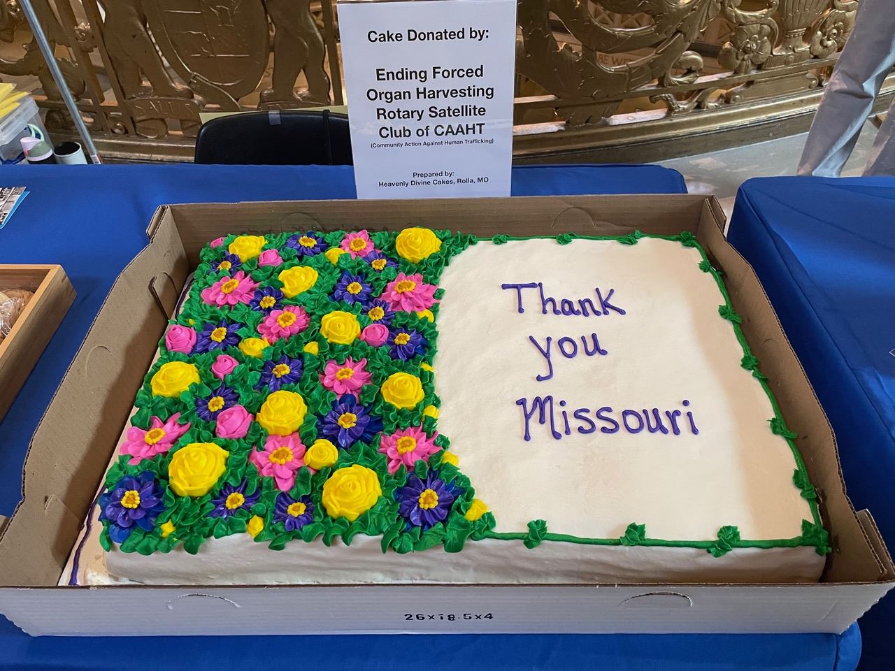 当地一家咖啡店慷慨地捐赠了烘焙食品用于招待会,终止强制摘取器官扶轮社所属的CAAHT(社区反人口贩卖行动,Community Action Against Human Trafficking)组织为活动捐赠了蛋糕。蛋糕上写着“谢谢密苏里州”,旨在感谢密苏里州众议院通过一项法案HB 2624,该法案阻止密苏里州人参加前往中国的器官旅游。