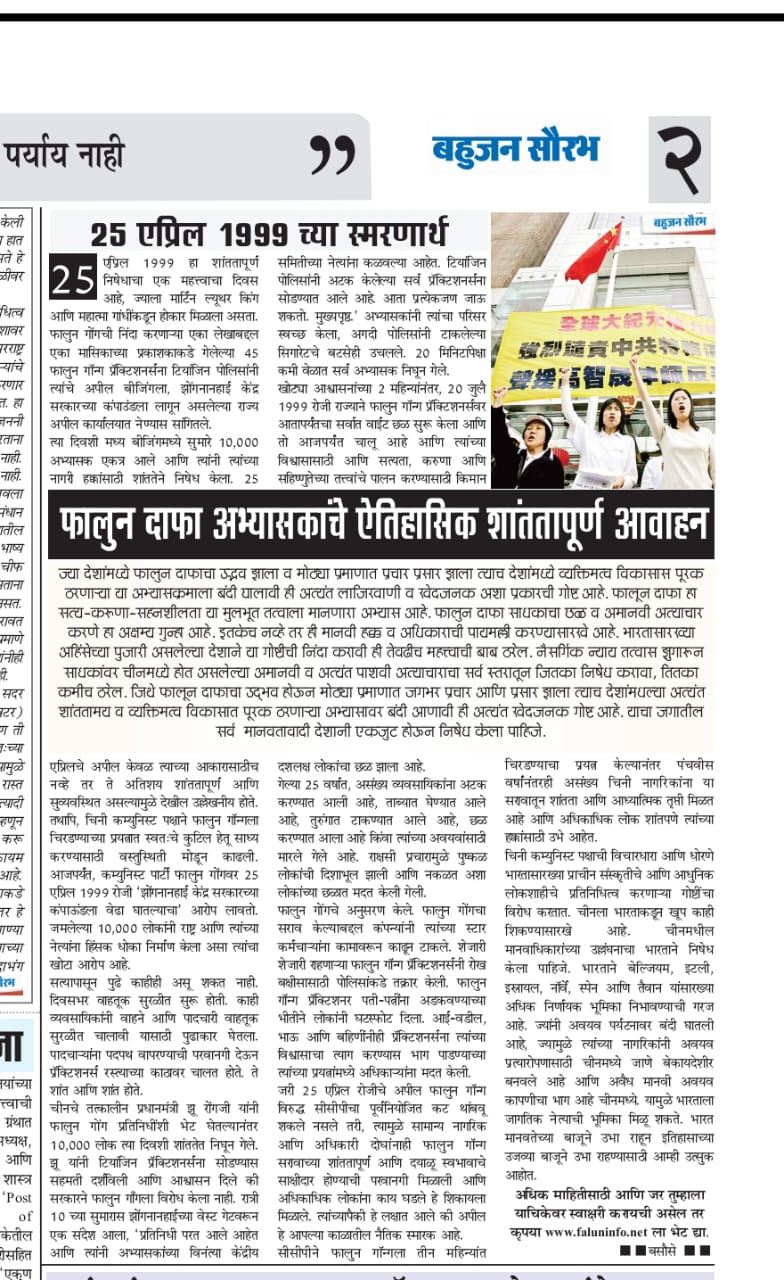 ![]() 图4:二零二四年四月二十五日,马拉地语报纸《Daily Bahujan Saurabh》编辑桑迪亚·拉朱卡(Sandhya Rajurkar)发表了一篇关于四·二五和平上访二十五周年的报道。 |