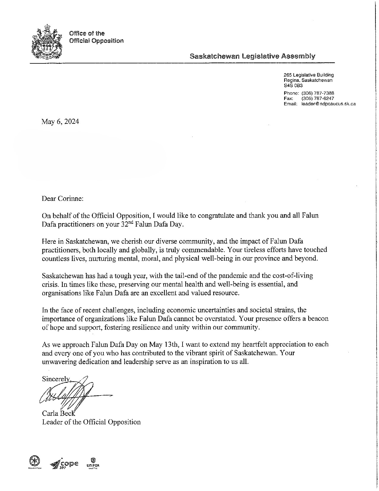 萨斯喀彻温省反对党领袖卡拉·贝克在贺信中说:在你们第32个法轮大法日之际,我谨代表萨斯喀彻温省反对党,祝贺并感谢所有法轮大法修炼者。