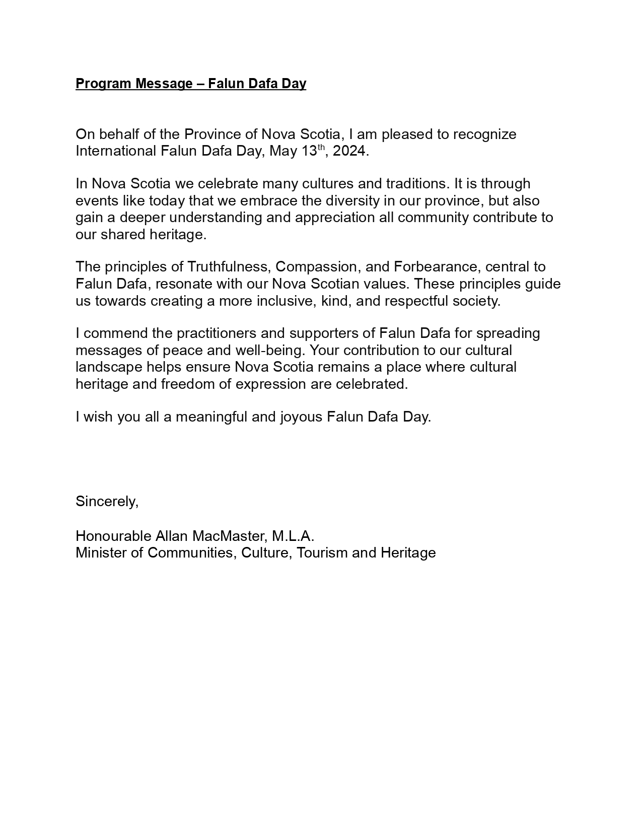 新斯科舍省社区、文化、旅游和遗产部部长艾伦·麦克马斯特在贺信中说:我很高兴代表新斯科舍省(Nova Scotia)宣布二零二四年五月十三日为世界法轮大法日。