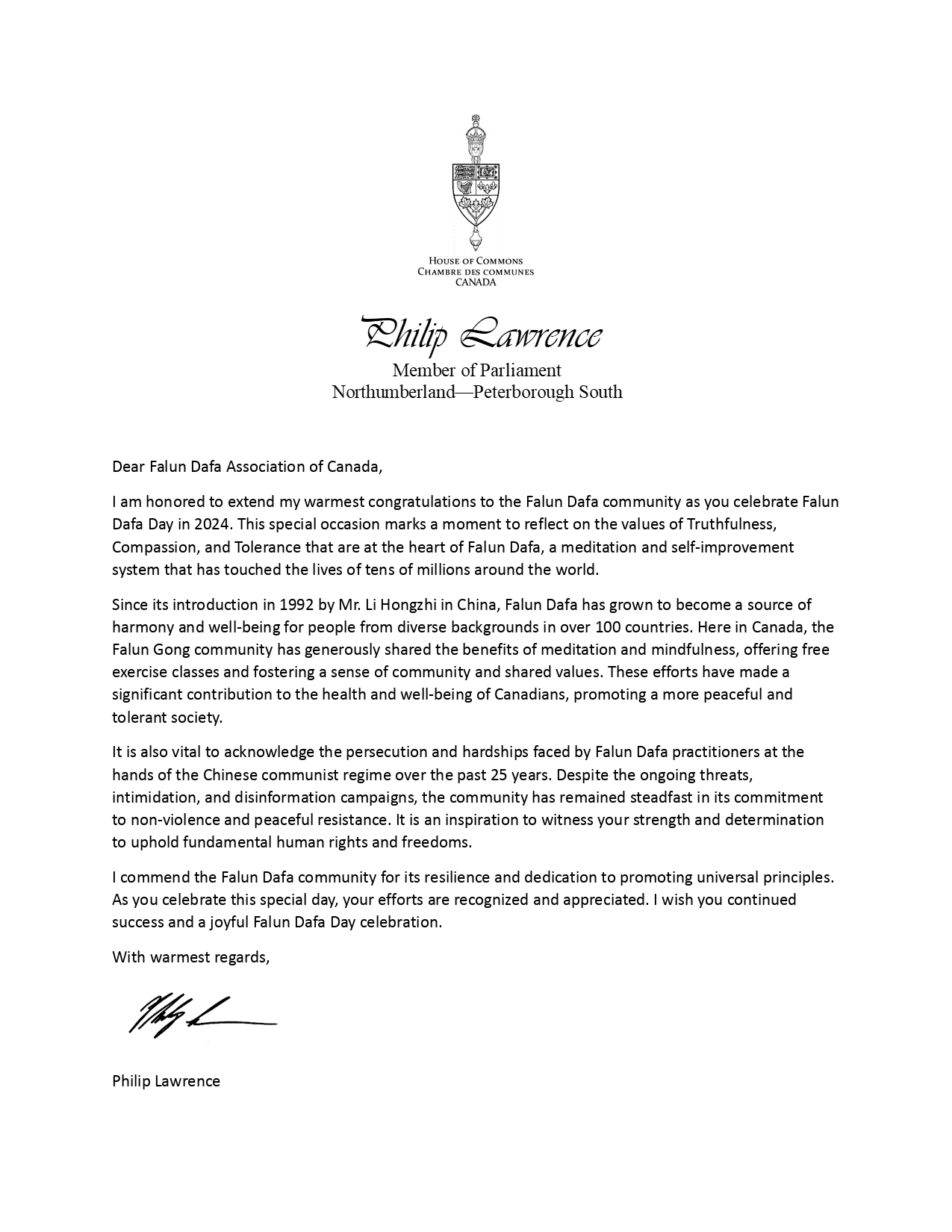 诺森伯兰-彼得堡南选区国会议员菲利普·劳伦斯在贺信中说:在你们庆祝二零二四年法轮大法日之际,我荣幸地向法轮大法团体表示最热烈的祝贺。在这个特殊的日子里,我们要深思“真、善、忍”的价值观,这些是法轮大法的核心价值。法轮大法是一种打坐修行和自我提升的信仰,已经影响了全世界数千万人的生活。