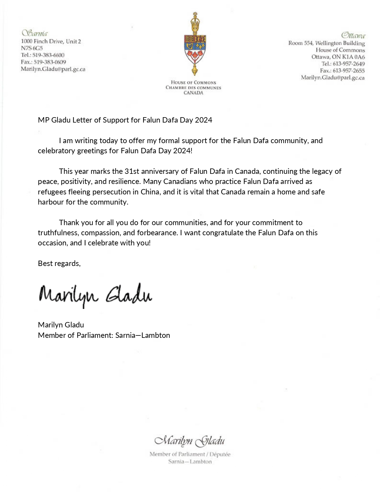 萨尼亚-兰姆顿选区国会议员玛丽莲·格拉杜在贺信中说:我今天写信正式表达对法轮大法团体的支持,并向二零二四年法轮大法日表示祝贺!