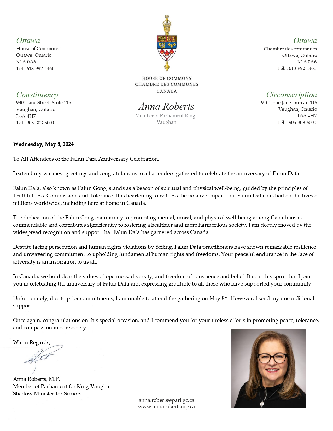 我很荣幸能够表彰并庆祝法轮大法修炼者群体作出的诸多贡献。我在这里表扬加拿大法轮大法协会为弘扬他们的信仰所做出的努力。
