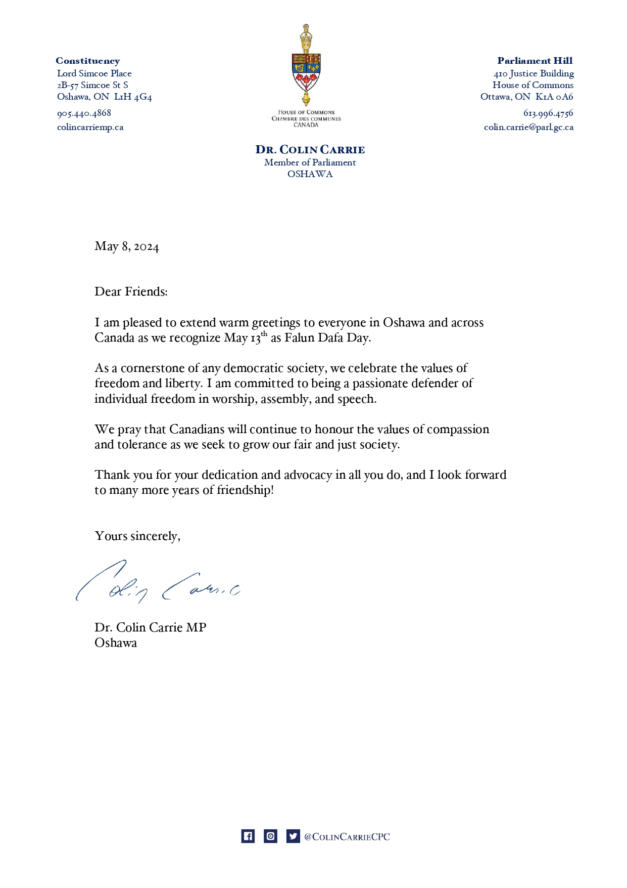 奥沙瓦选区国会议员科林·卡里在贺信中说:很高兴在五月十三日法轮大法日到来之际,向奥沙瓦选区居民以及加拿大各地的每一位朋友致以亲切的问候。
