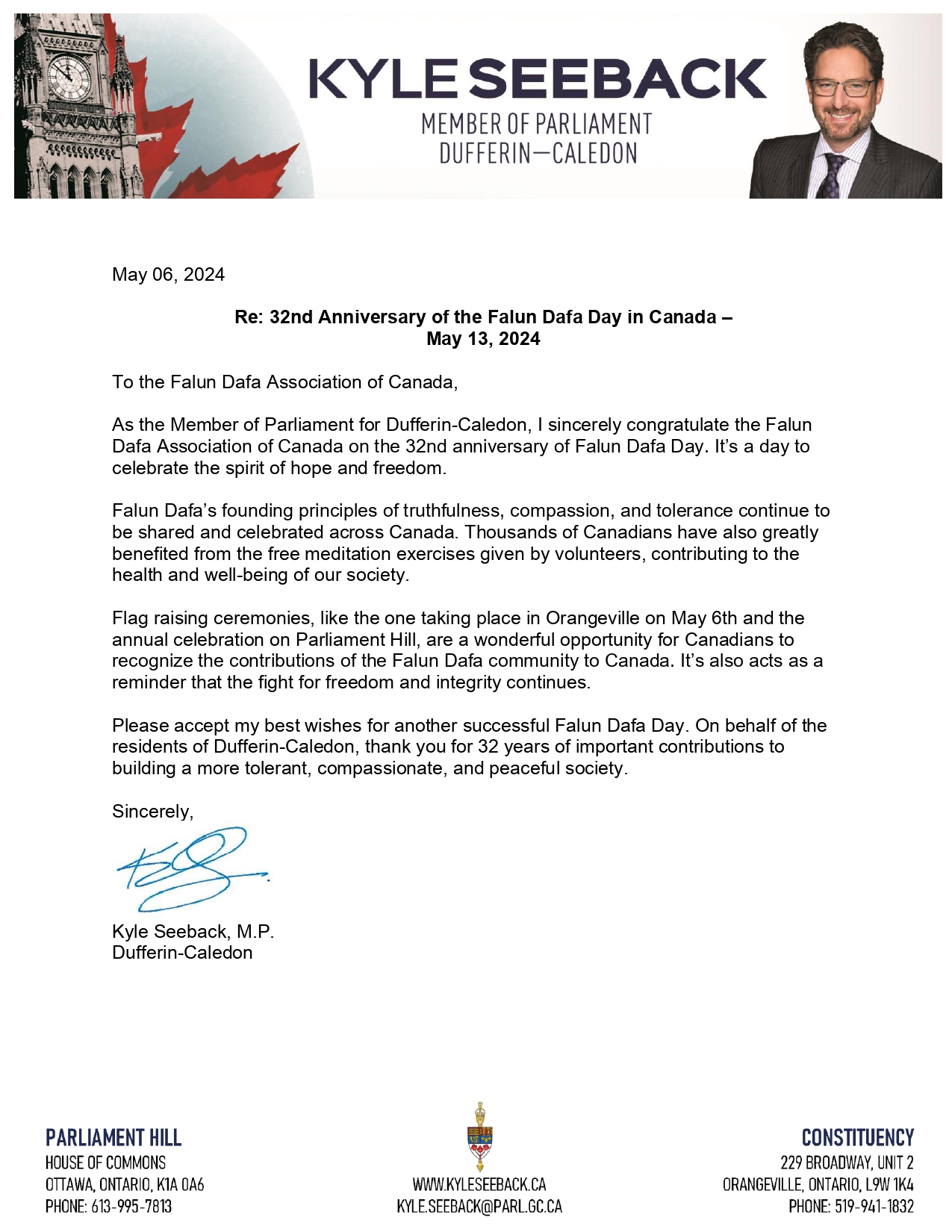弗林-卡莱登选区国会议员凯尔·塞贝克、在贺信中说:在加拿大法轮大法协会庆祝法轮大法传世三十二周年的纪念日里,作为达弗林-卡莱登选区的国会议员,我送以衷心的祝贺。这是一个庆祝希望与自由的日子。