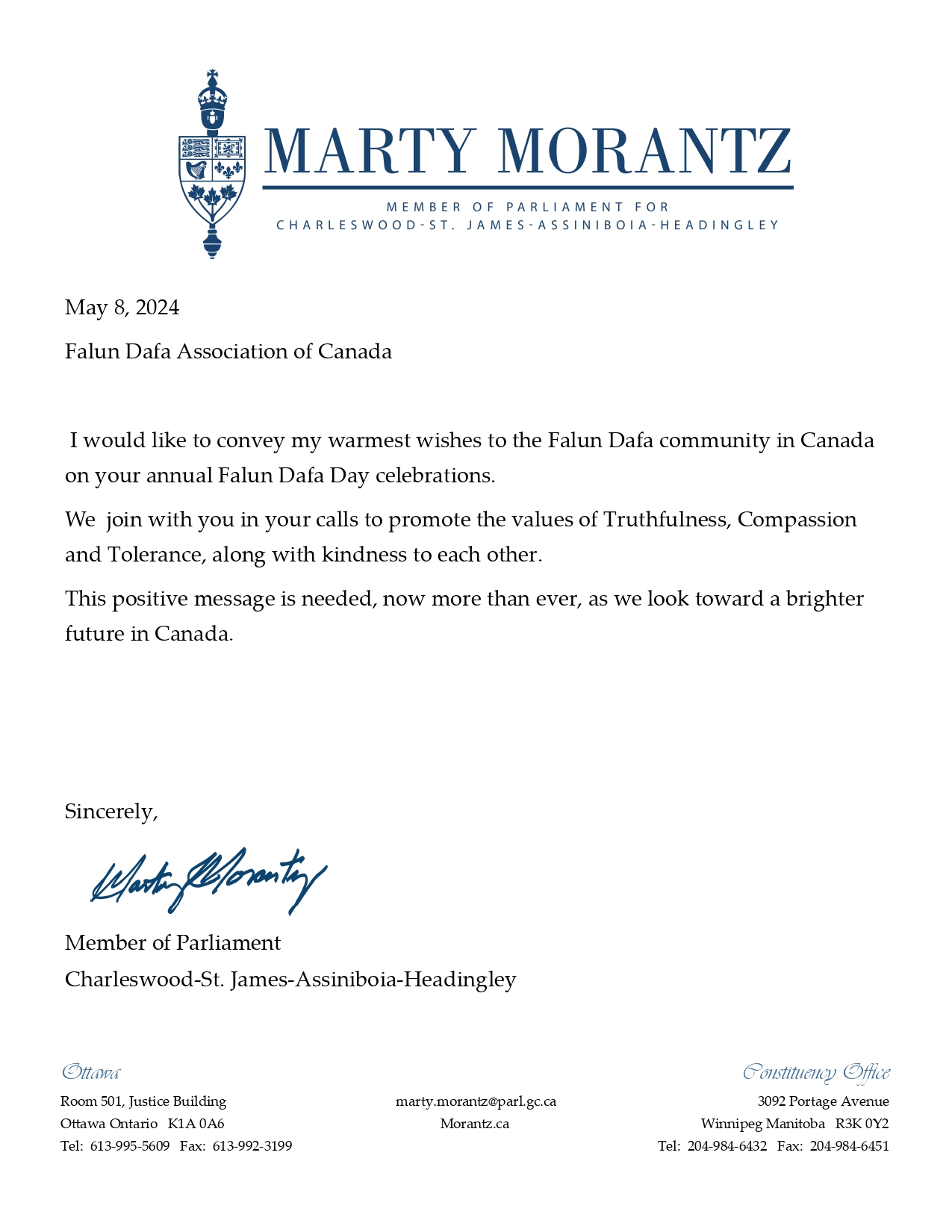 ![]() 图9:曼尼托巴省国会议员马蒂·莫兰兹(Marty Morantz)的贺信 |