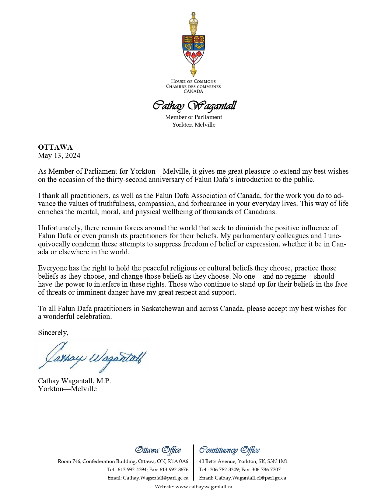 ![]() 图10:萨斯喀彻温省国会议员国泰瓦·甘塔尔(Cathay Wagantall)的贺信 |
