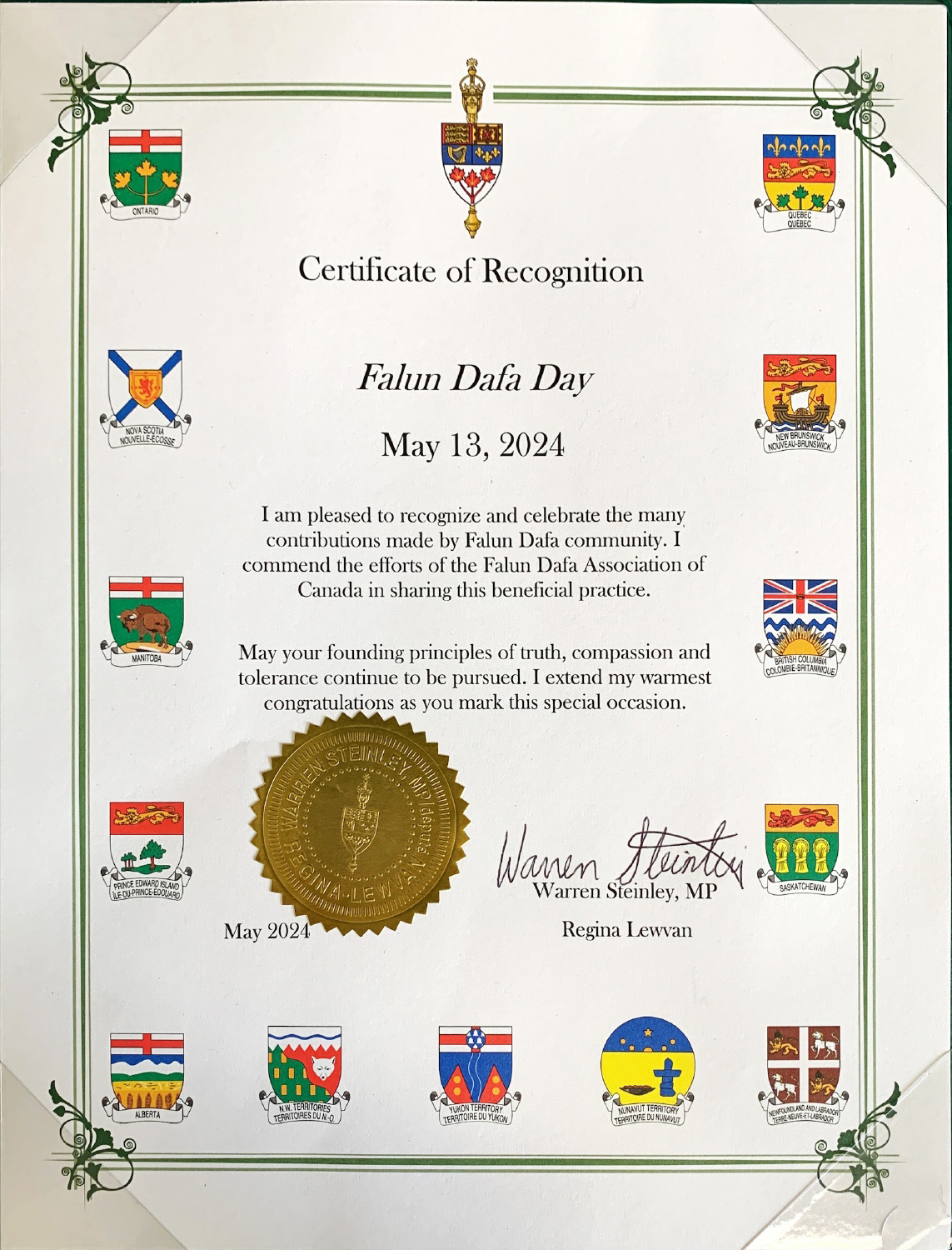 萨斯喀彻温省国会议员沃伦·斯坦利在贺信中说:认证二零二四年五月十三日法轮大法日。