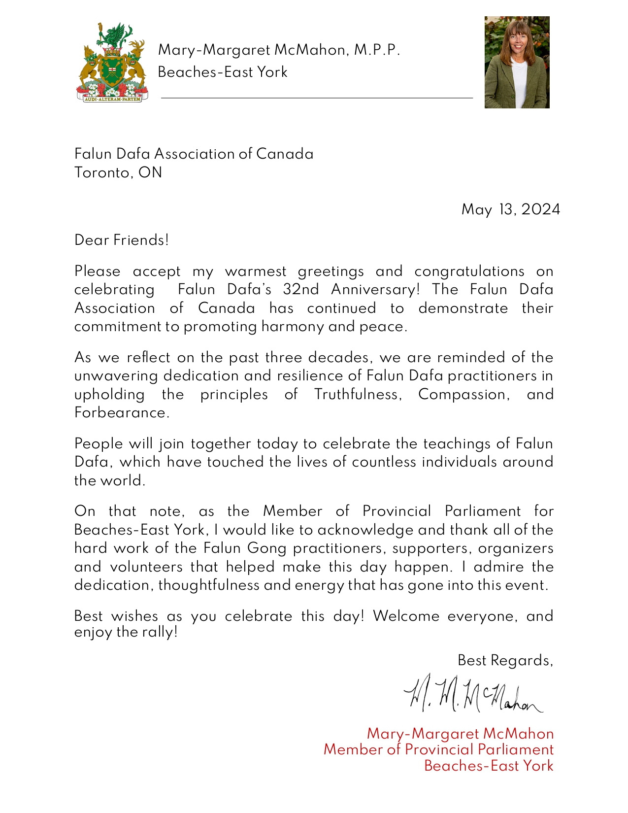 湖滨-东约克省议会议员玛丽-玛格丽特·麦克马洪在贺信中说:值此法轮大法弘传世界三十二周年之际,请接受我最温暖的问候和祝贺!一直以来,加拿大法轮大法协会的成员们都在向人们展现他们的和谐与平和。