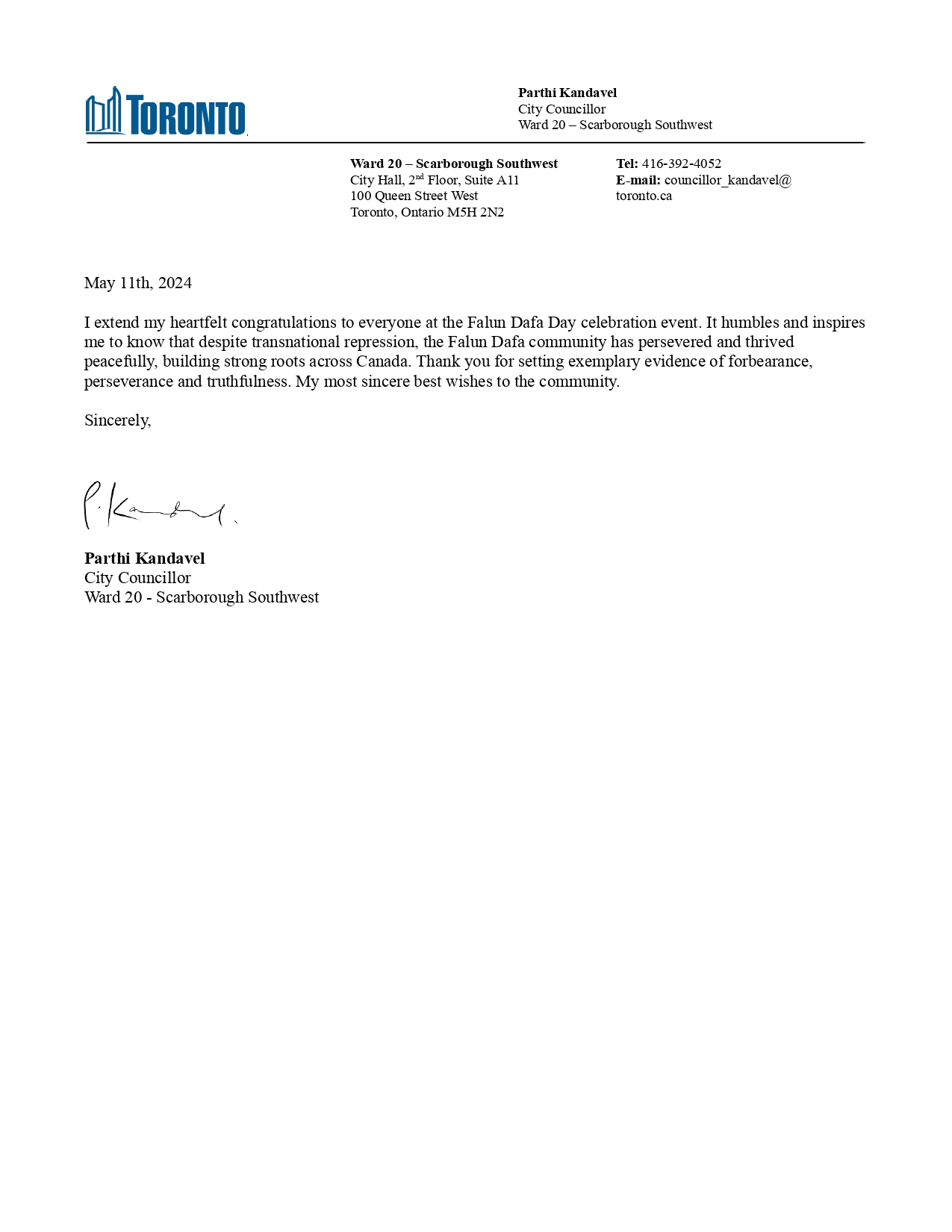 ![]() 图14:第20选区-士嘉堡西南市议员帕蒂·坎达维尔(Parthi Kandavel)的贺信 |