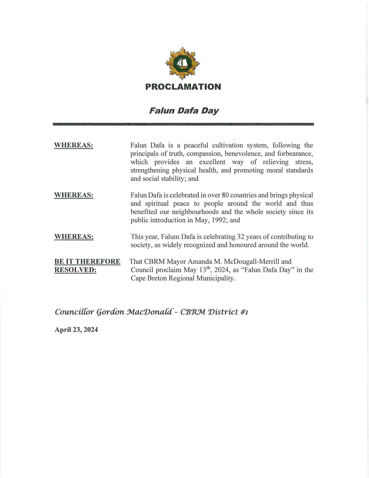 布雷顿角岛的市长阿曼达·麦克杜格尔和市议会宣布二零二四年五月十三日为布雷顿角岛的法轮大法日。