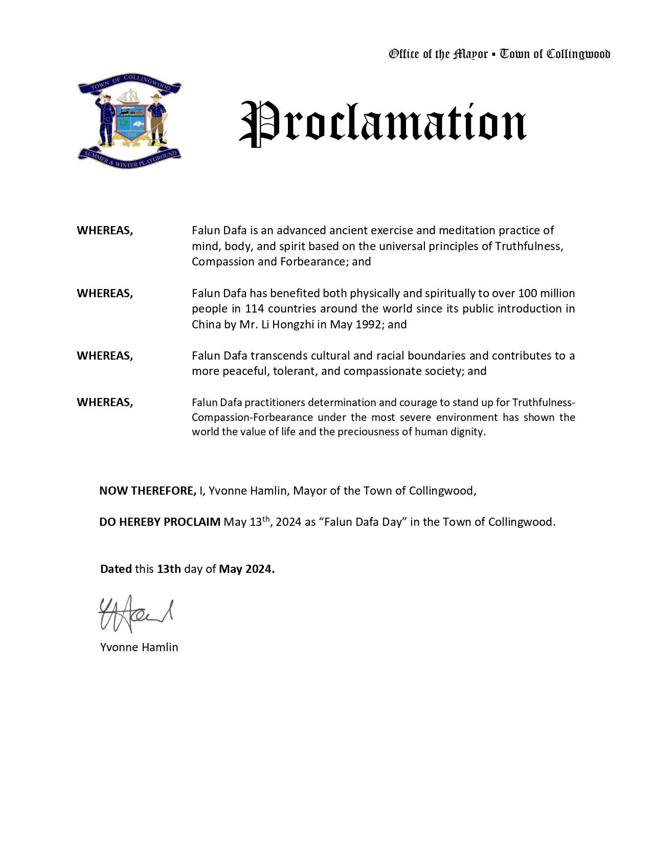 因此,我,科灵伍德镇镇长伊冯娜·哈姆林,特此宣告二零二四年五月十三日为科林伍德镇的“法轮大法日”。