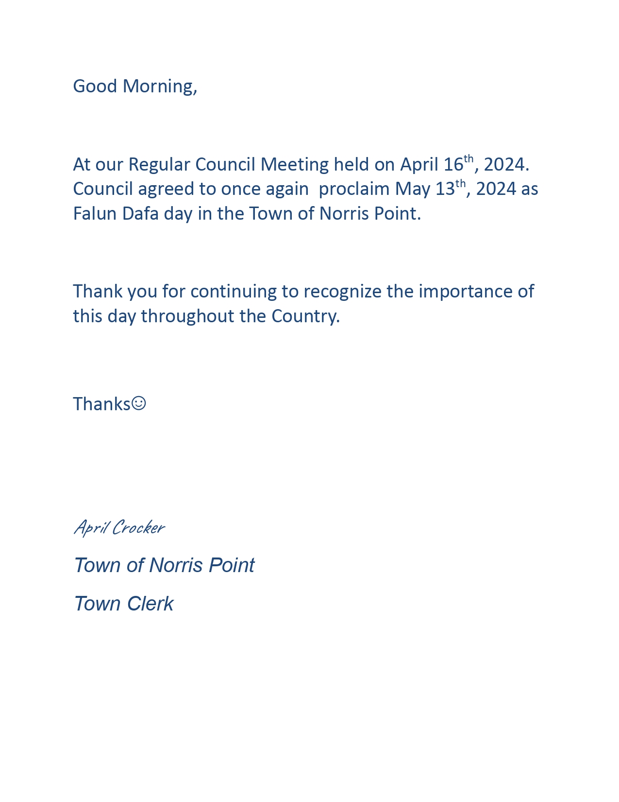 诺里斯角镇镇议会秘书阿葡丽尔·克罗克在贺信中说:在我们于二零二四年四月十六日举办的例行议会的会议上,议会再一次同意将二零二四年五月十三日宣布为诺里斯角镇的法轮大法日。