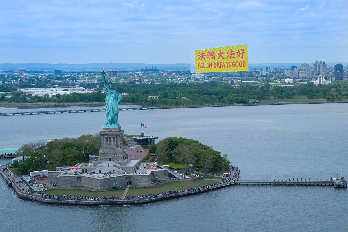 当天在纽约曼哈顿哈德逊河的上空,蓝天白云下,长80英尺、高40英尺,黄底红字的“法轮大法好”(FALUN DA IS GOOD)中英文巨型横幅,在天空中高高飞扬,背景为曼哈顿的高楼大厦,包括自由女神像、世界贸易中心、帝国大厦等许多著名地标,场景蔚为壮观。